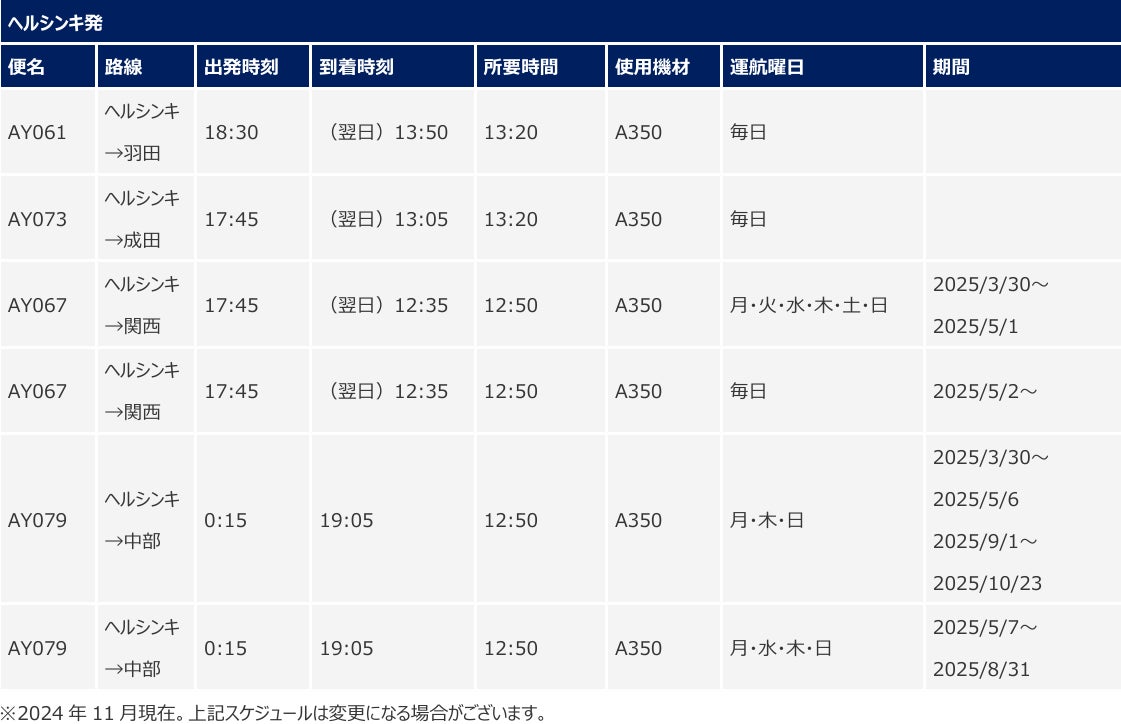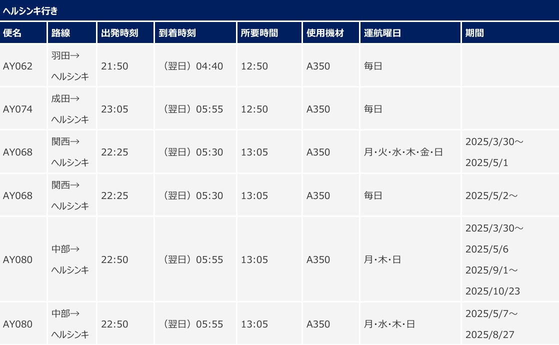 フィンエアー日本発着路線フライトスケジュール(2025年3月30日~10月25日)