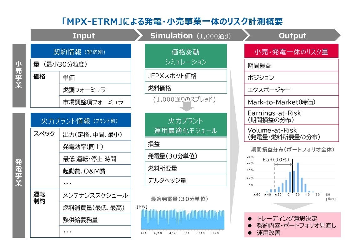 今般、伊藤忠エネクスに提供する火力プラントの運用最適化モジュールは、MPX-ETRMの追加機能の一つです。これにより、市場価格の変動に対して、火力プラントを効率的に運用することで得られる価値を定量化することで、小売事業と発電事業の一体的なリスク管理が可能になります。