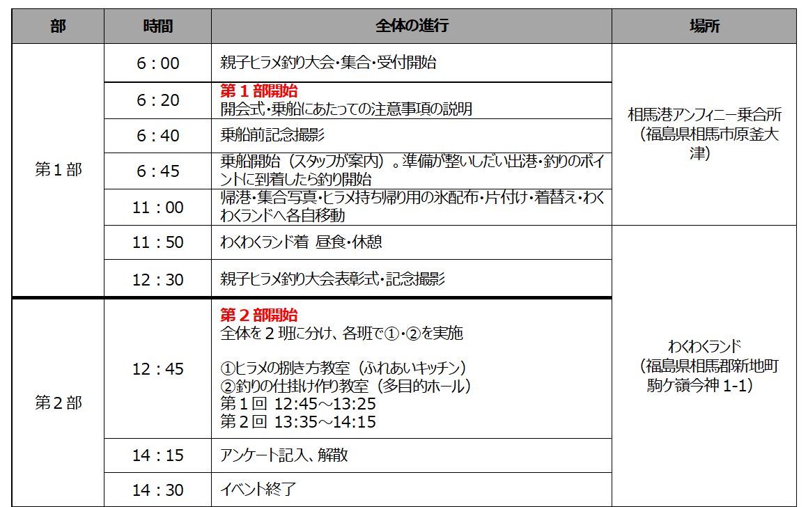 実施内容・目的:抽選で選ばれた親子が、俳優・タレントの杉浦太陽さんと共に親子ヒラメ釣り大会やヒラメの捌き方・釣りの仕掛け作り教室を通じて、福島の海の幸に触れ、その魅力を体感していただく