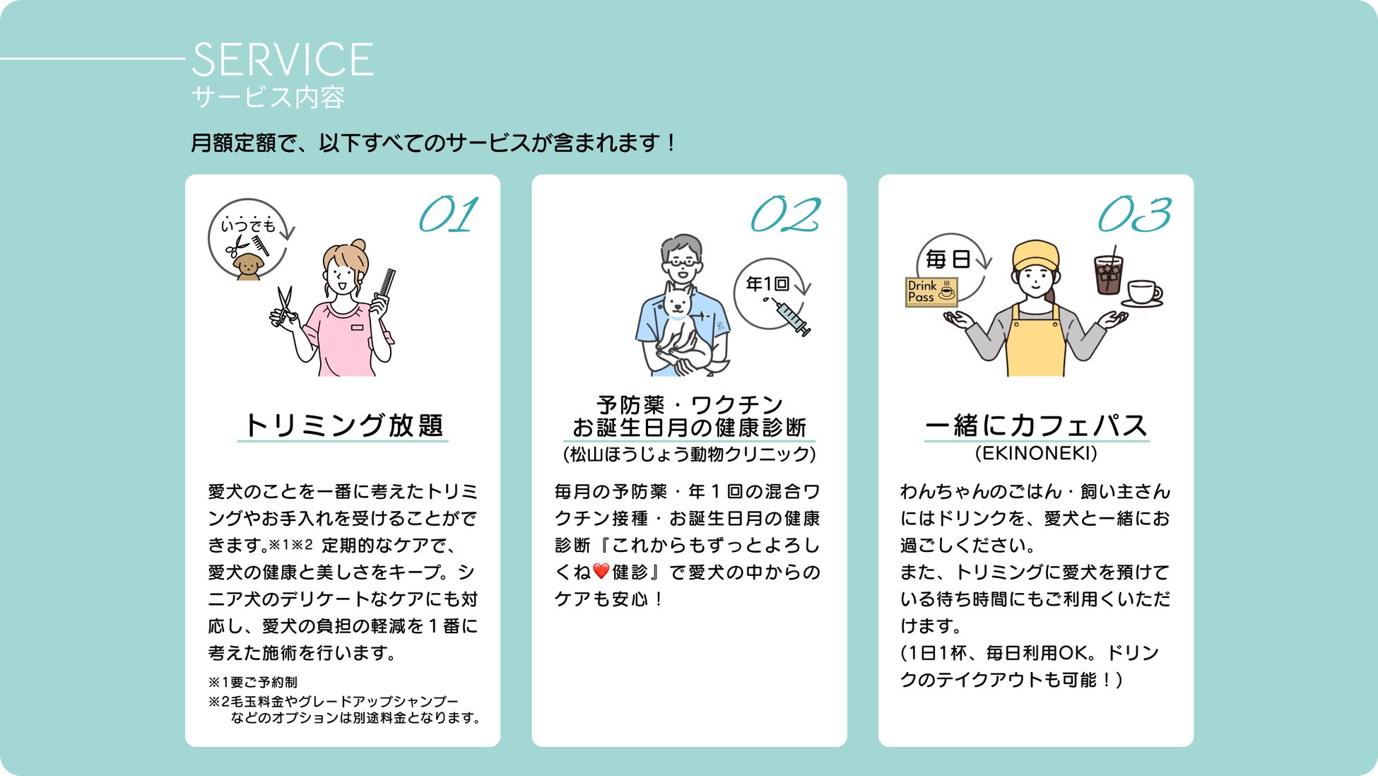 本サービスは「2週間〜1ヶ月の定期的なトリミングが理想的」という想いを背景に生まれ、費用面の負担を気にせず、愛犬をこまめにケアできるのが特徴です。