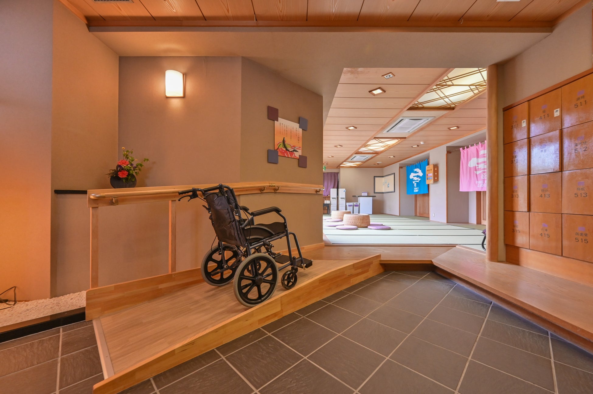 ・バリアフリーの貸切風呂:スロープや手すりを備え、安心して温泉を楽しめる環境をご提供。