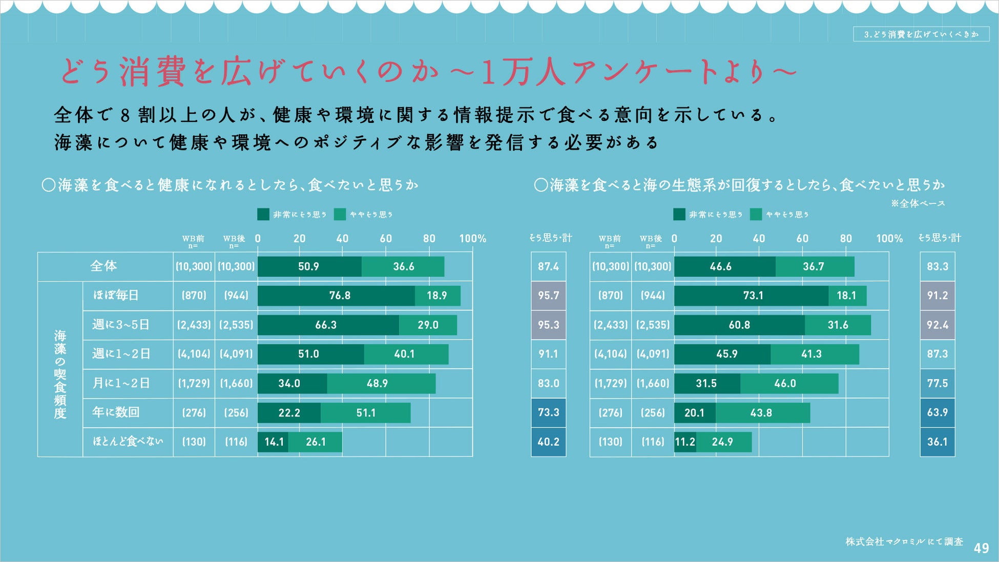 「海藻を食べると健康になれる」「海藻を食べると海の生態系が回復する」としたら、食べたいかという質問で、全体の80%以上が「そう思う」と回答。このことから、海藻が及ぼす健康面や環境面へのポジティブな影響を発信することで、喫食頻度を上げられる可能性があることがわかりました。