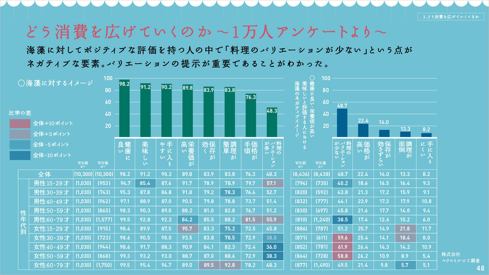 海藻に対して「健康に良い」「栄養価が高い」「美味しい」と評価する消費者における海藻のネガティブなイメージは「料理のバリエーションが少ないこと」が48.7%でトップに。海藻の喫食頻度を上げるには、料理のバリエーションを提示することが重要だとわかりました。
