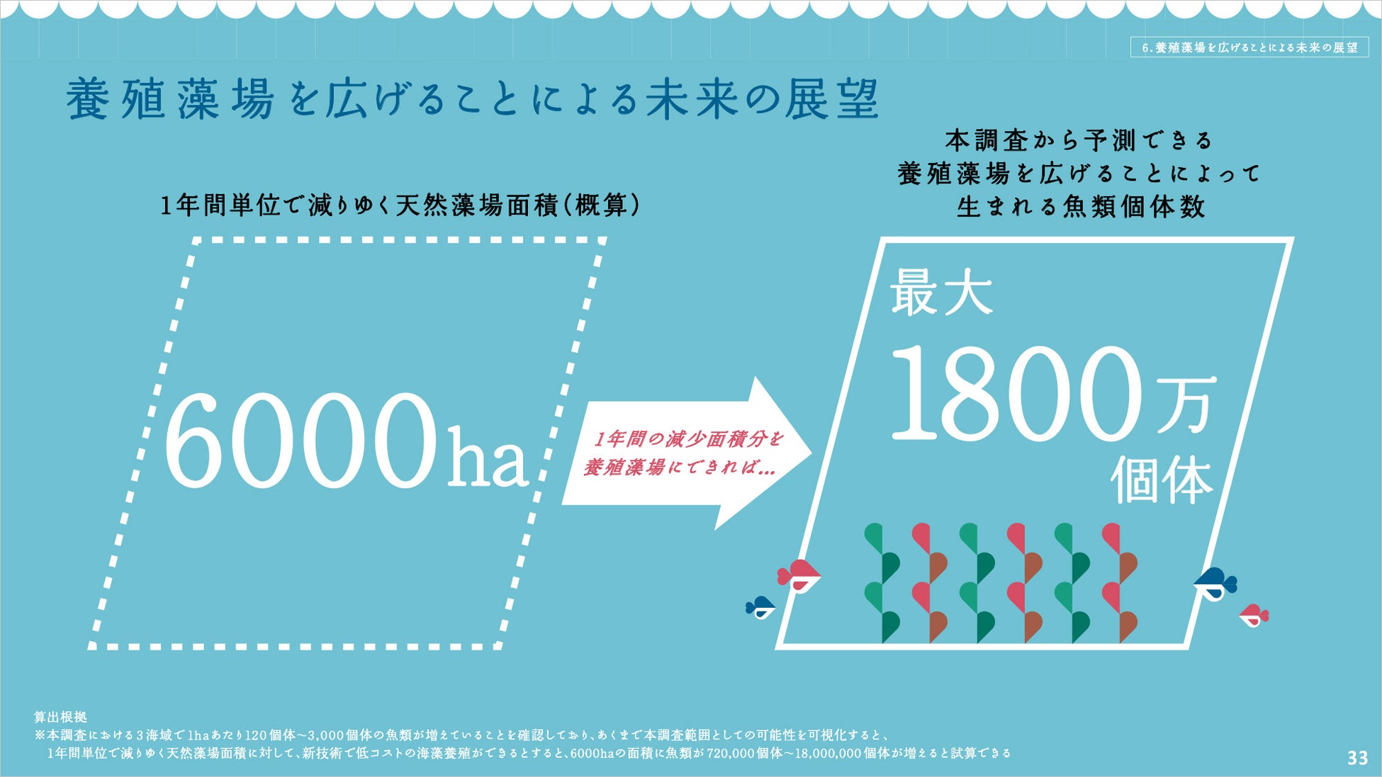 一年あたりで減る天然藻場面積は、6,000haの試算です。この減少面積を、仮に養殖藻場を広げることができれば、最大1,800万個体の魚類個体数を生むことができます。