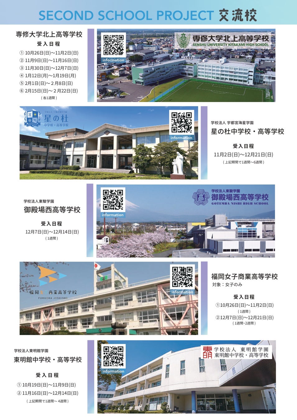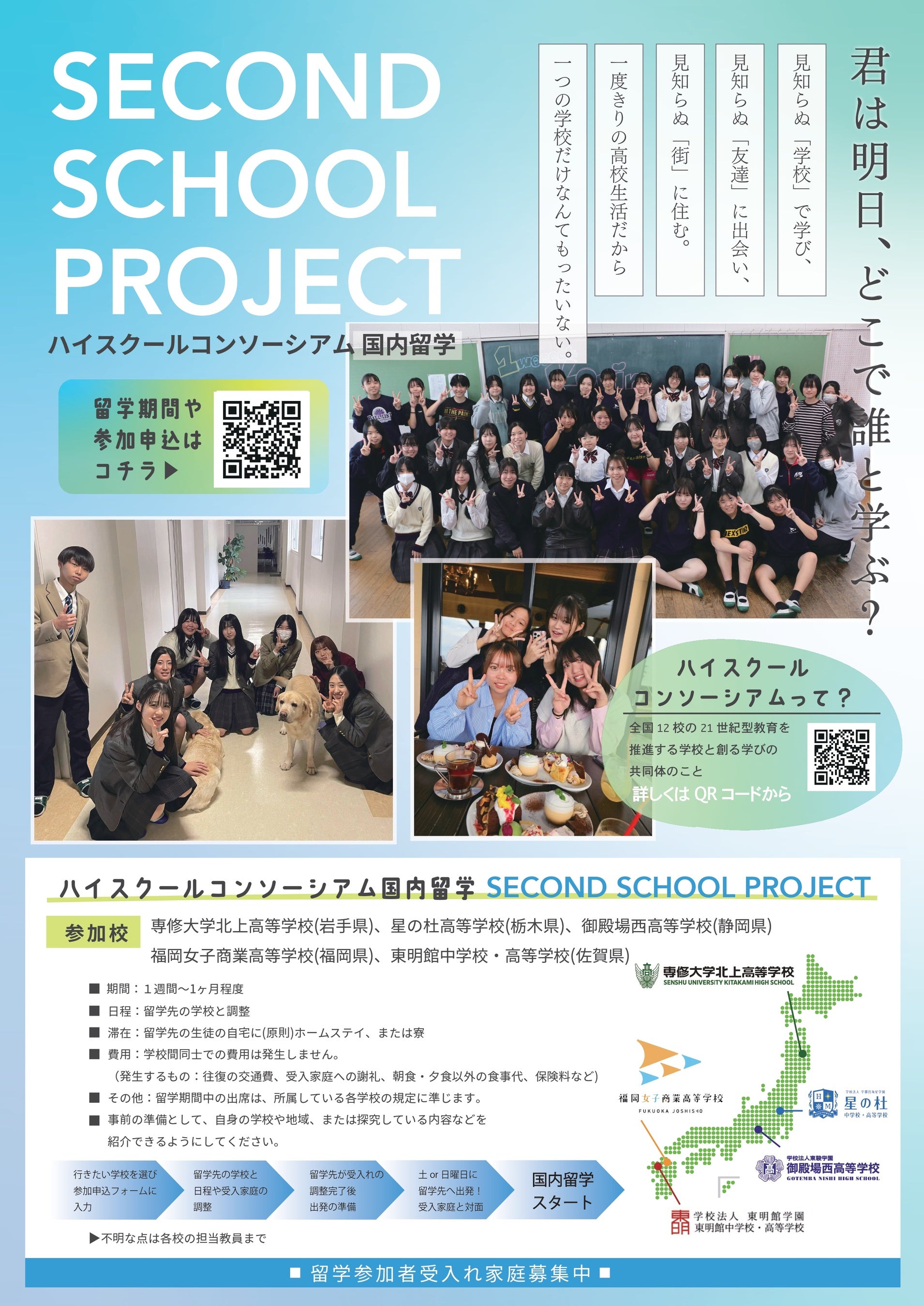 星の杜中学校・高等学校(栃木県 校長:小野田一樹)、専修大学北上高等学校(岩手県 校長:阿部伸)、御殿場西高等学校(静岡県、校長:勝間田貴広)、福岡女子商業高等学校(福岡県、校長:柴山翔太)東明館中学校・高等学校(佐賀県、校長:神野元基)は、全国の21世紀型教育を推進する12校による「ハイスクールコンソーシアム」の一環として、“国内交換留学”を2025年11月より2026年1月にかけて、順次実施します。『Second School Project(セカンドスクールプロジェクト)』と題して、新たな学びの機会を創出します。