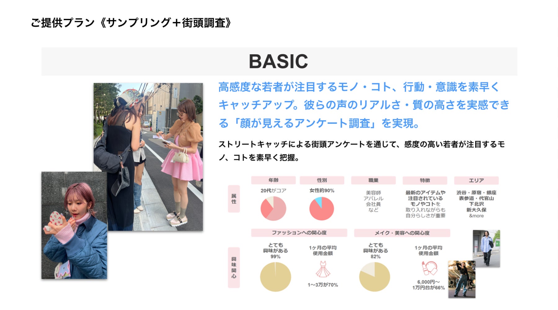 ストリートキャッチによるインタビュー形式の口頭アンケートを通じて、感度の高い若者が注目するモノ、コトを素早く把握できます。フォーカスできる商材はファッションだけではなく、メイクやスキンケアアイテム、美容家電、スイーツなど、衣・食・住・サービスを含む生活文化全般に至るまで、幅広い分野への対応が可能です。