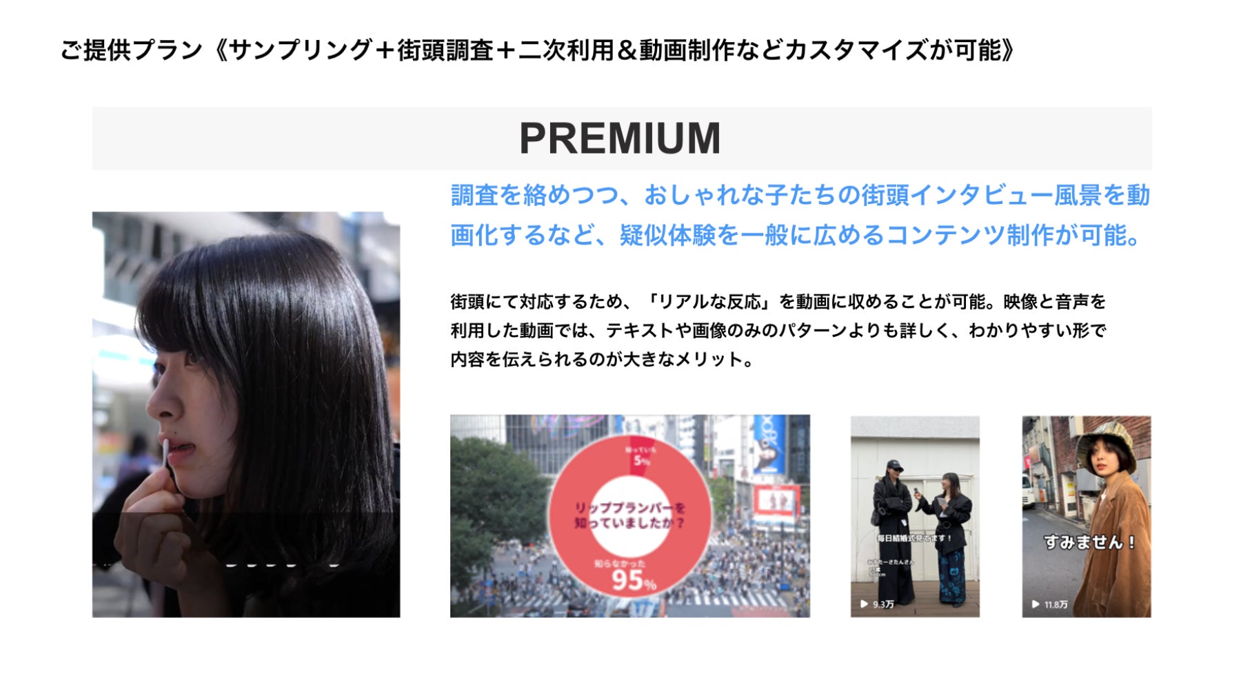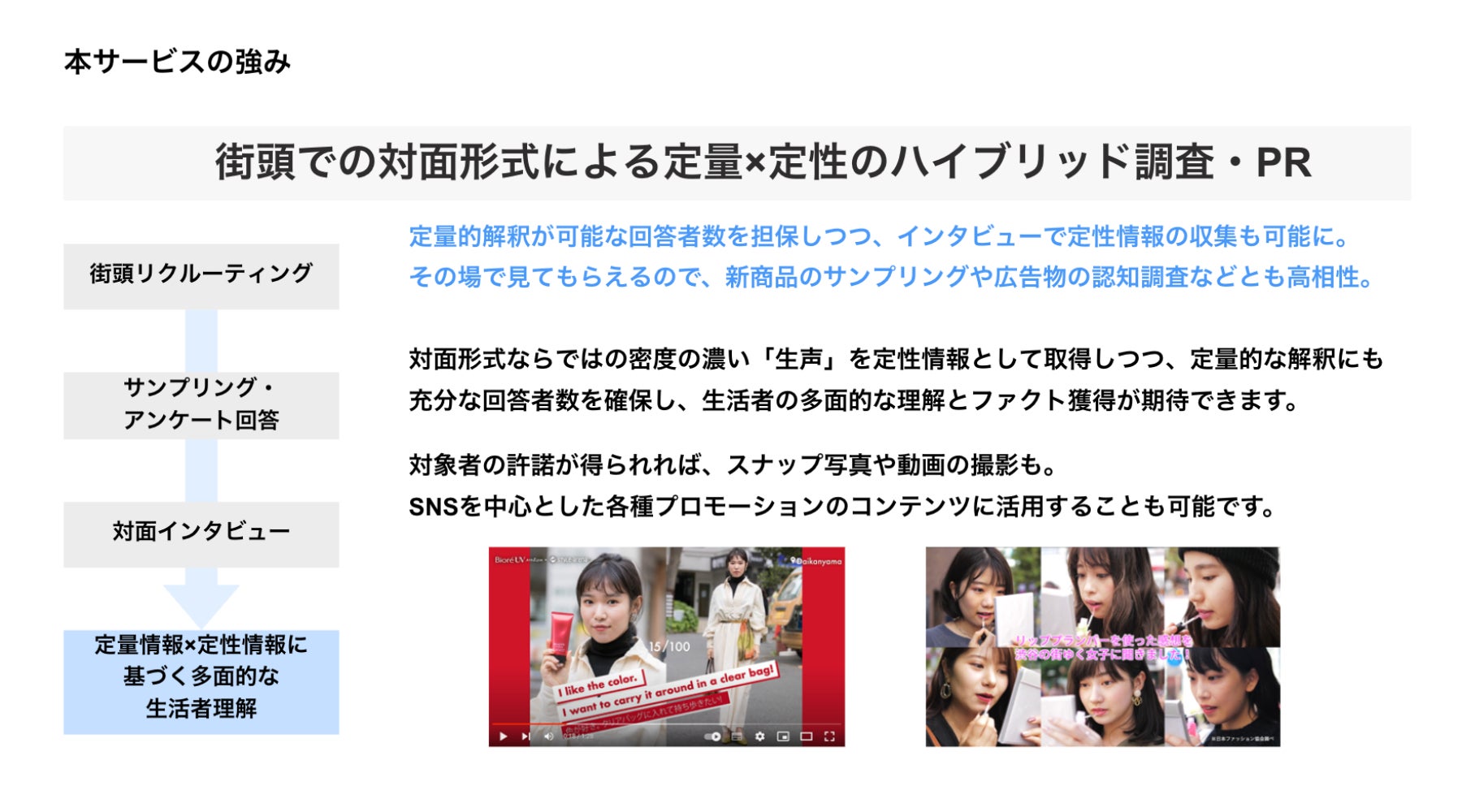今後、街頭アンケート・インタビュー調査、街頭サンプリング、街頭インタビュー動画制作など、ストリートを主戦場としたプランは、より解像度の高い消費者理解に基づいた商品開発、販促施策等の立案のお役に立てることと思います。