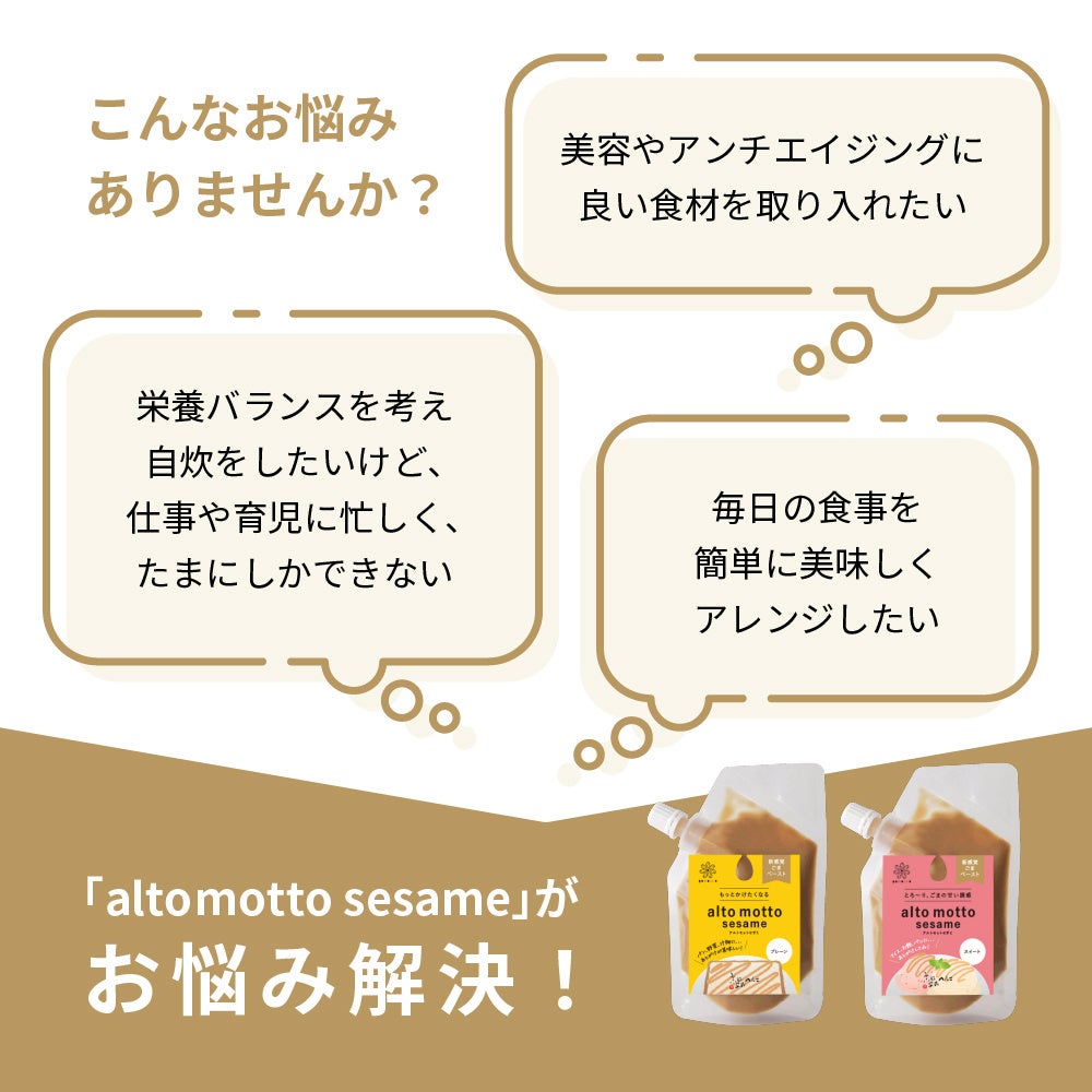 『alto motto sesame』は、そうした声に応えるかたちで、現代のライフスタイルに適した「新しいごまペースト」としての再設計を実施。ごまが持つ栄養価・風味・コクを活かし、日々の料理に“ちょい足し”することで、手軽に美味しさと健康をプラスできる万能調味料として提案します。