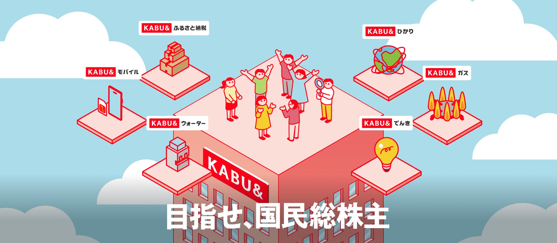カブ&ピースは「目指せ、国民総株主」をテーマに、日本国内における株式投資家を増やし、日本国経済を活性化させることをミッションに掲げています。展開する事業は、生活インフラ関連事業で、電気やガスなど、多くの国民に関与するサービスを提供します。また、これらのサービスの利用者に、サービス利用の対価として、当社の株式を保有してもらう仕組みを同時に提供することで、当社ミッションの「国民総株主」を早期に実現させることを目指します。