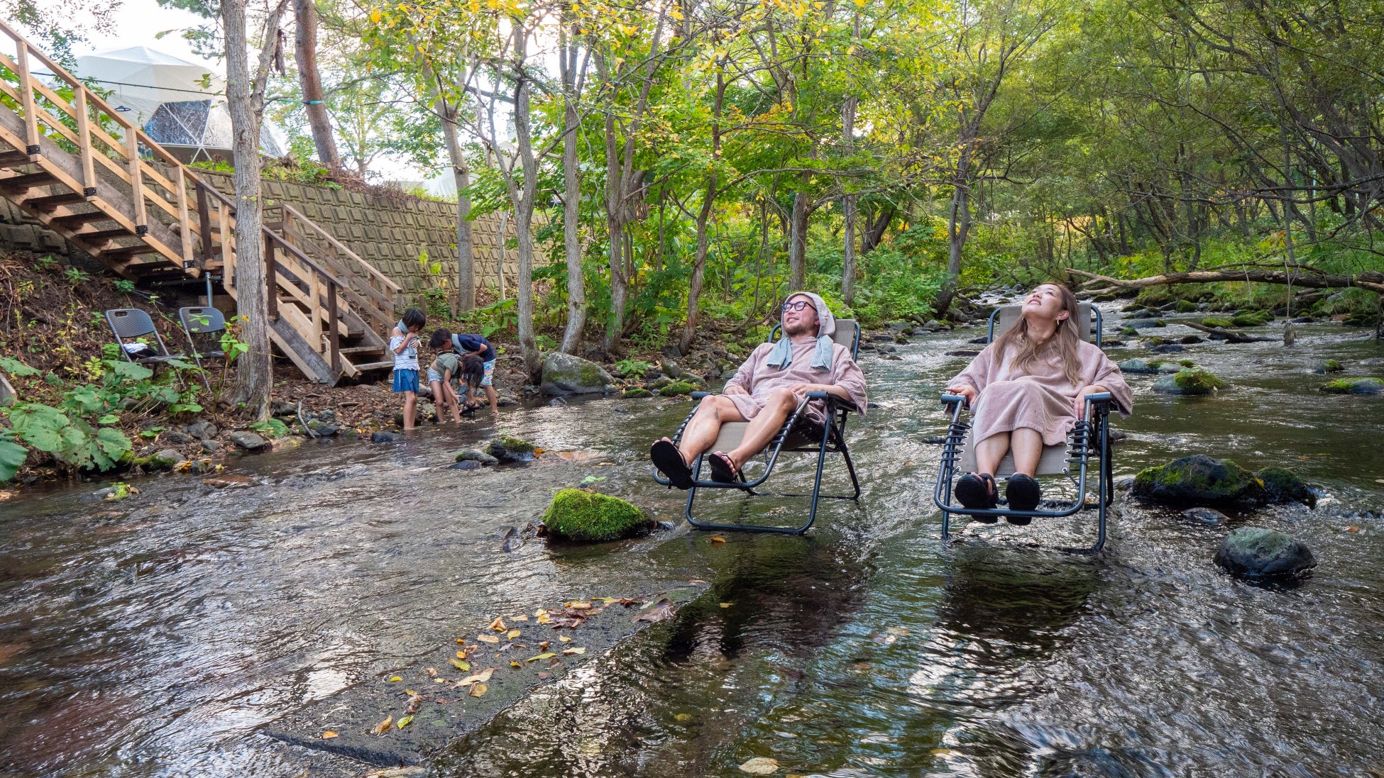 目の前を流れる美しい朝里川で森林浴や天然水風呂を楽しむことで、火照った身体を心地よくクールダウンできます。川のせせらぎを聴きながらの外気浴はまるで自然と一体になるかのような感覚を味わえます。自然に囲まれた特別な空間で、日常のストレスを忘れ、心から整ってください。