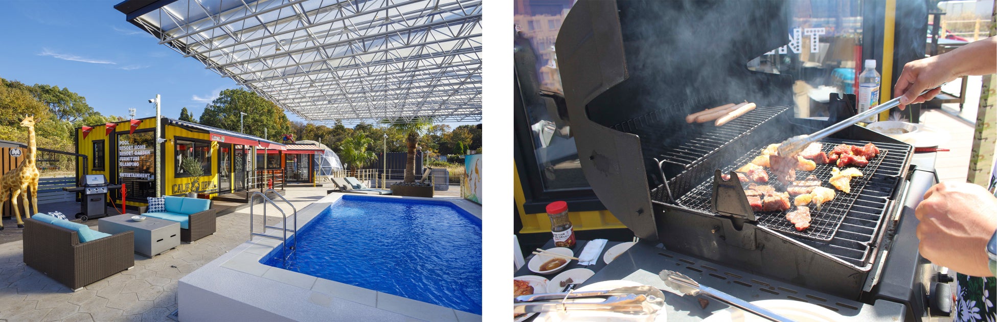 BBQグリルの貸出も可能です。プライベートプールサイドで気軽にBBQパーティを楽しめます。自由な食材を持ち寄って、ワイワイBBQを楽しもう!空調設備のある屋根のある個室、ガーデンファニチャー、冷蔵庫、シャワー室など楽しむ準備が整っています!
