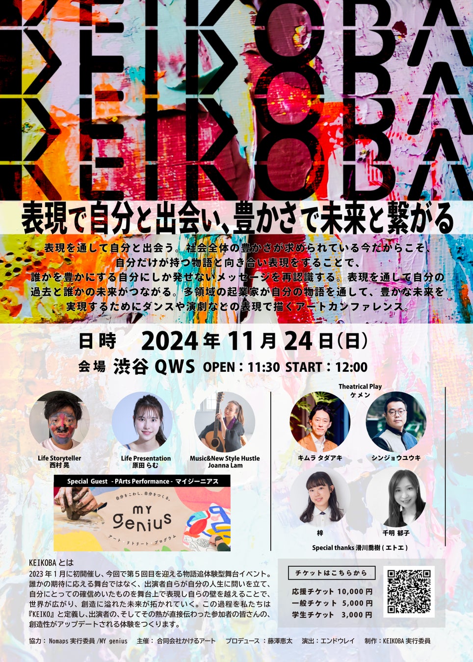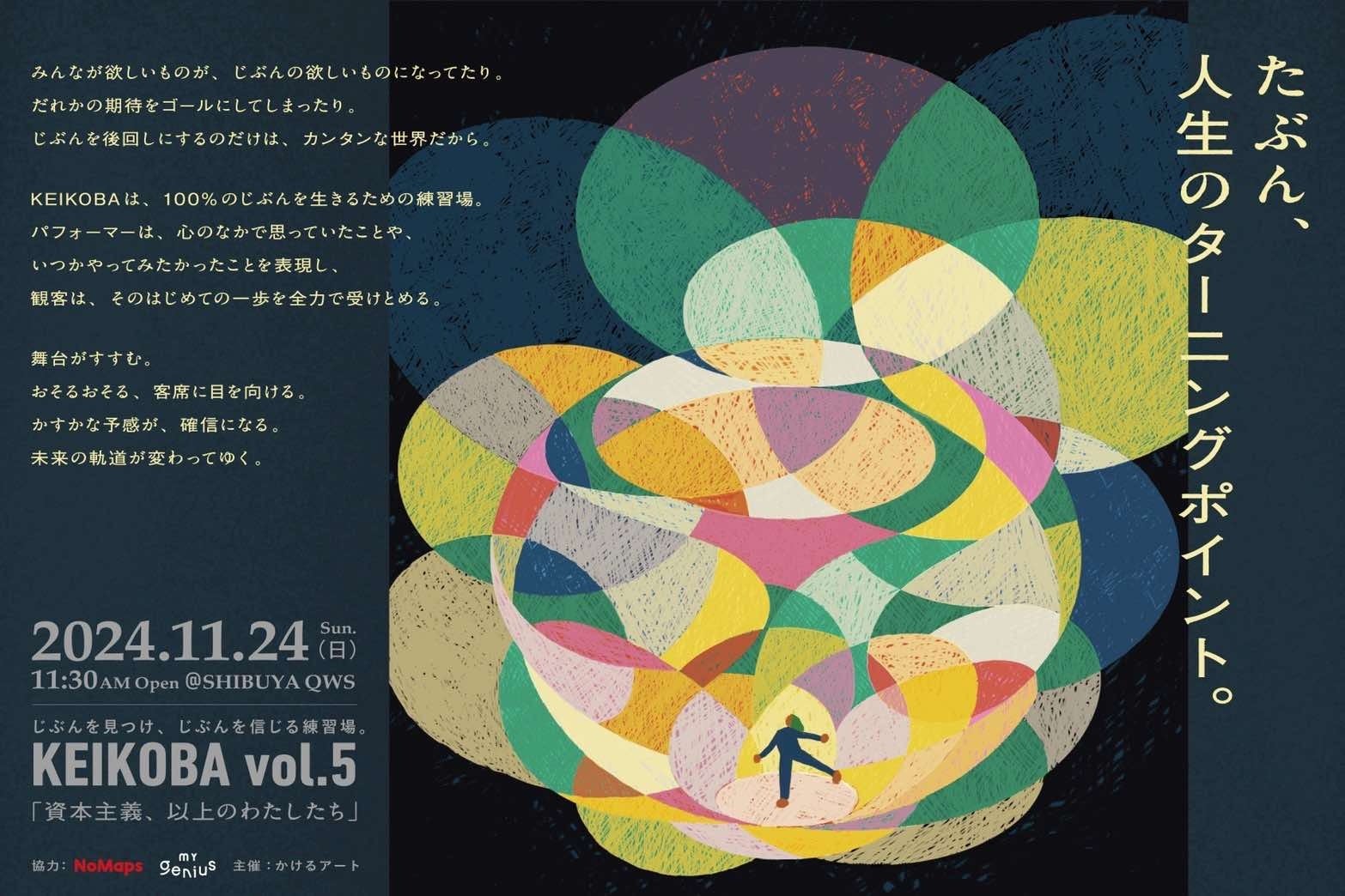 合同会社かけるアート(代表社員 藤澤 恵太)は、出演者それぞれが自分を見つけ、100%の自分を表現するアートカンファレンス『KEIKOBA vol.5 資本主義、以上のわたしたち』を、11月24日(日)SHIBUYA QWS スクランブルホールにて開催いたします。