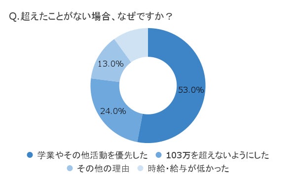 「103万の壁を超えないようにするため」と回答したのが約1/4、「学業やその他の活動を優先した」が最も多く約半数。