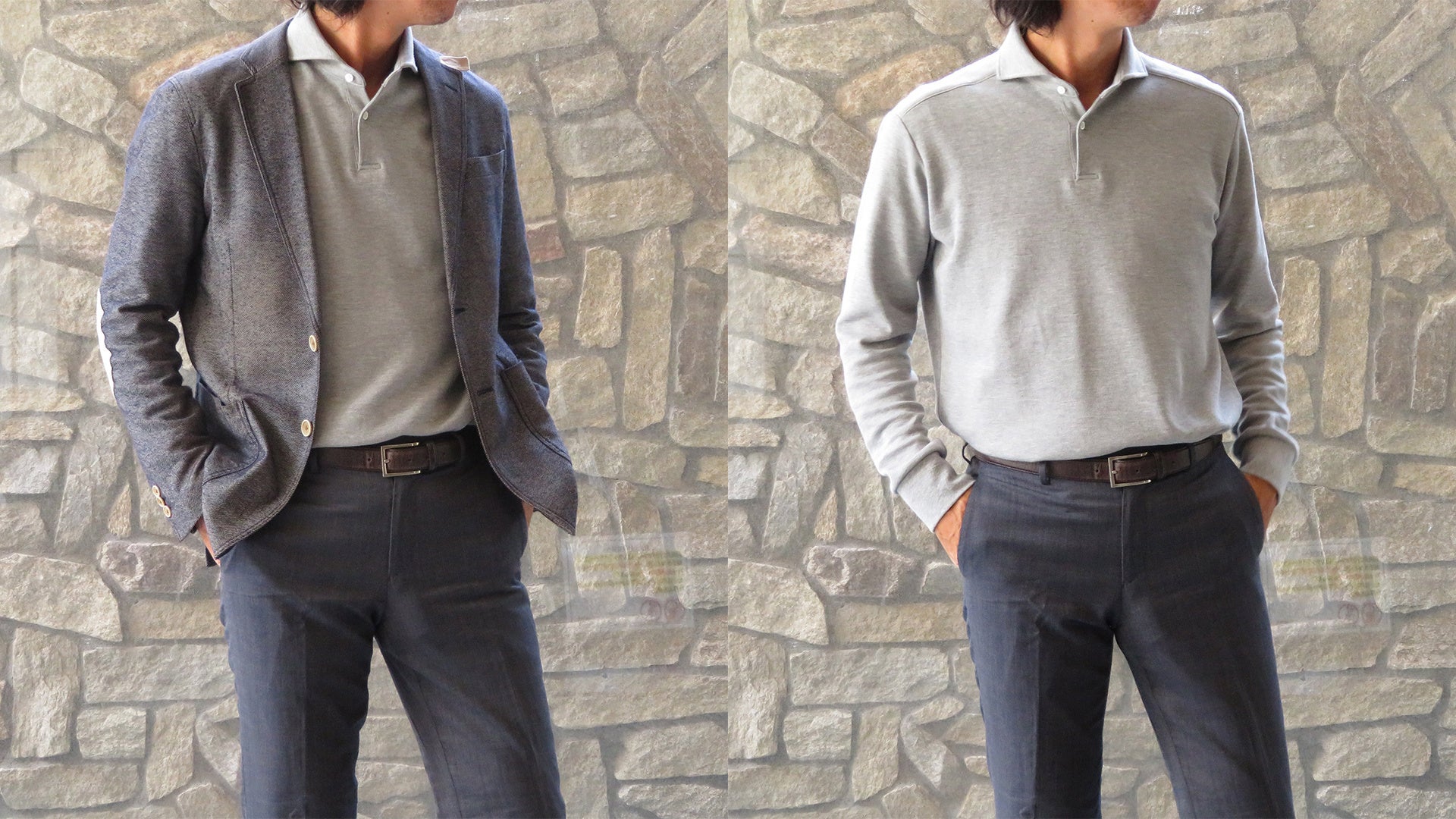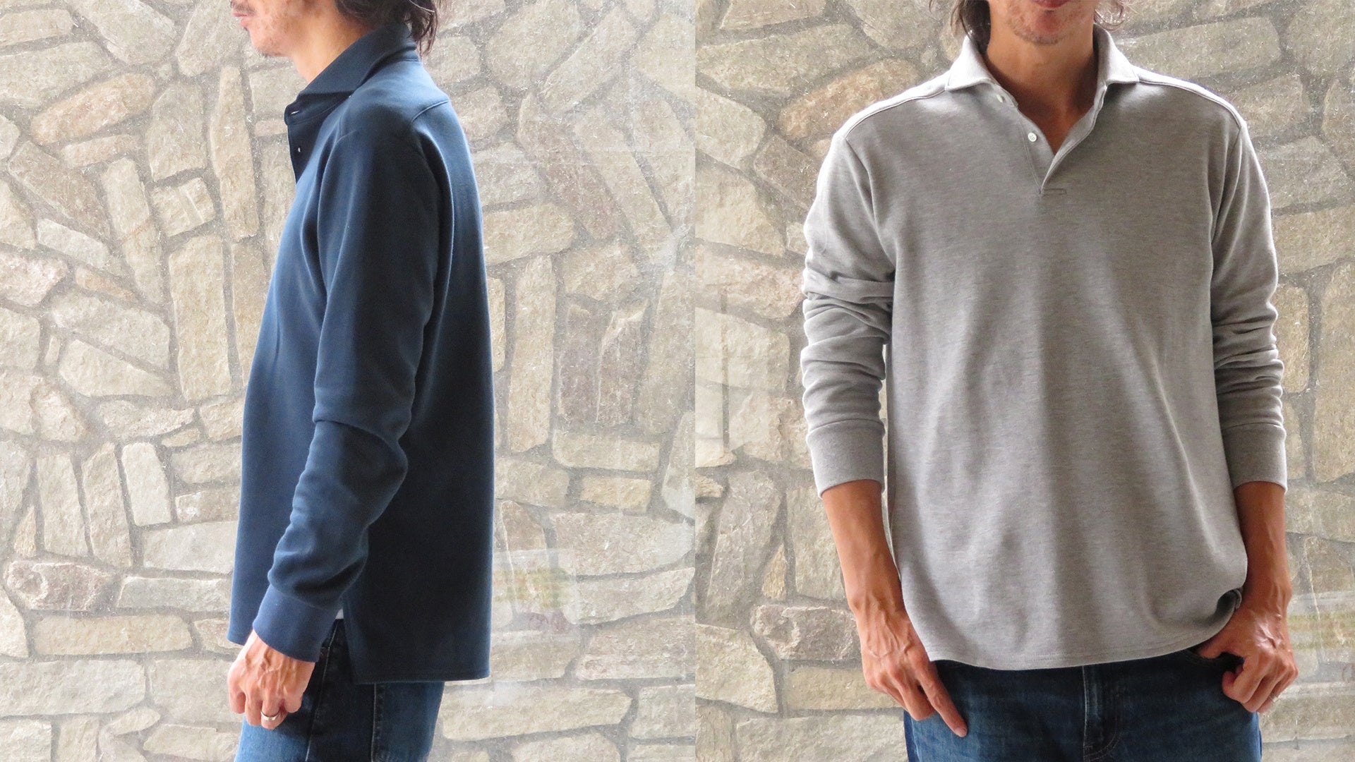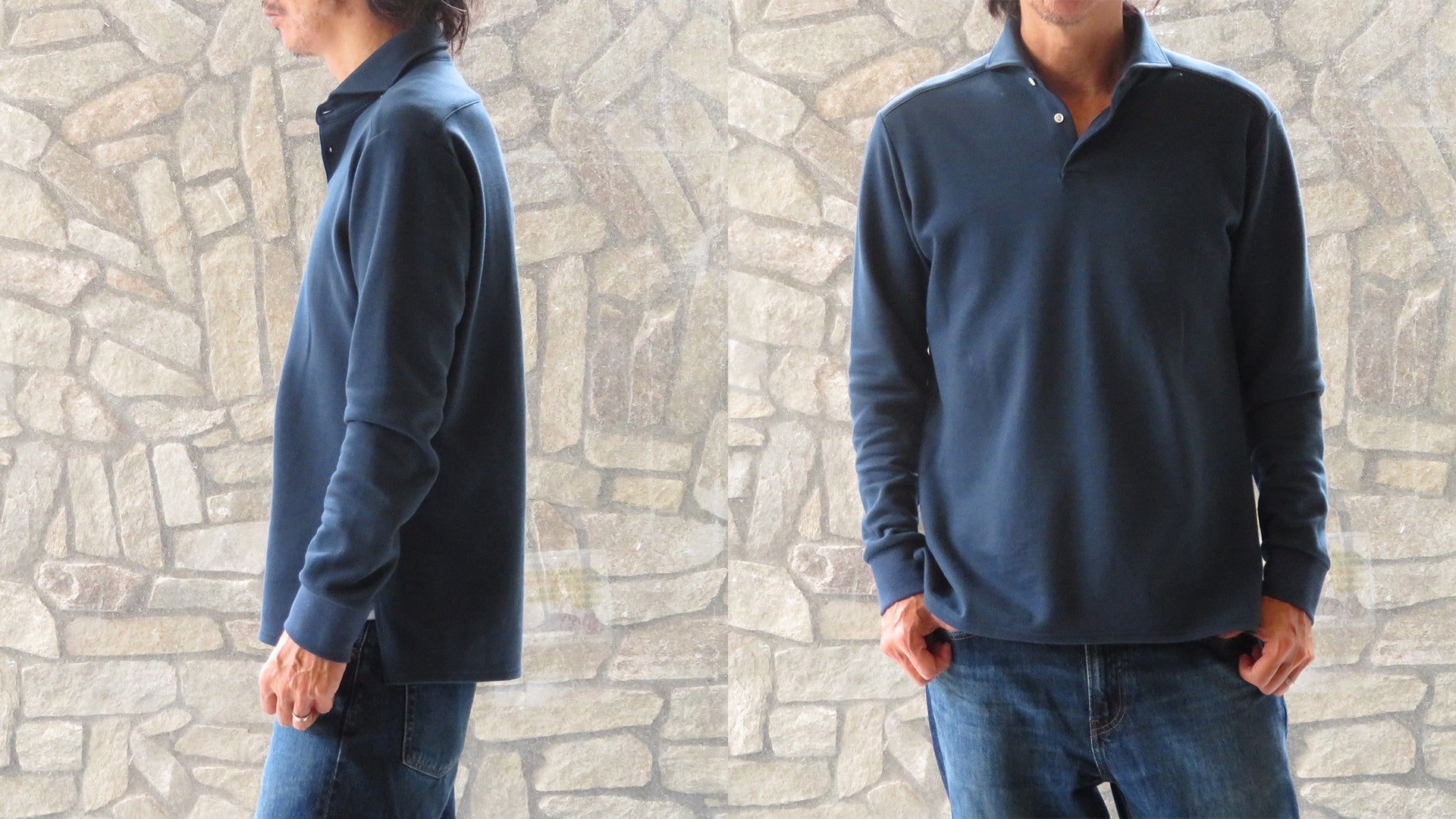天然繊維に拘り、日本の伝統素材、伝統技術を駆使し「心和むものづくり」をコンセプトにしているブランド和心衣。今回は代表が以前から思っていたことを形にしました。クールビズという言葉が出て以降、夏場はポロシャツをビジネス風に着る「ビズポロ」が定着しているが、秋冬にもそういう需要は無いものなのか?。また、ビジネスシーンでのカジュアル化が進み、シャツの需要が減少している中、新たなシャツの形を創れないかと考えました。どんなアイテムとシャツを組み合わせるのがいいかと考え、リラックス感を感じれるトレーナーとシャツを組み合わせるという発想に至りました。