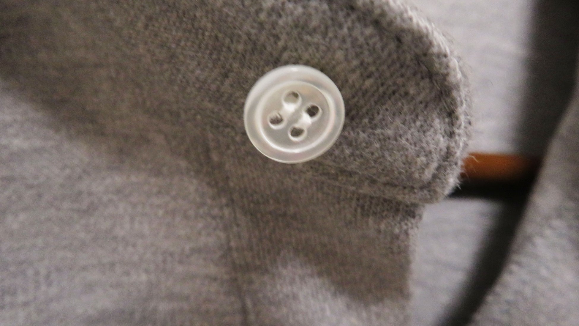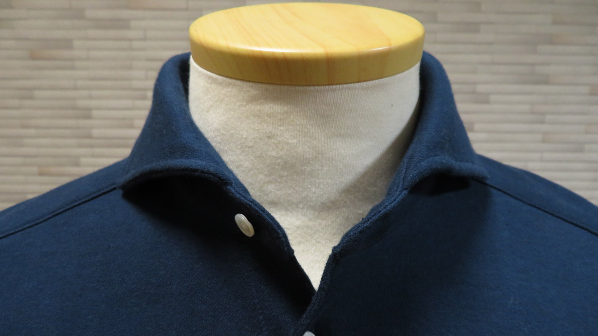 衿型はタイドアップでもノーネクタイでも様になるカッタウェイカラー。肩ヨークもしっかりつけたシャツ仕様にしております。袖口はトレーナーのリラックス感もいれたリブ仕様。釦は高級シャツで使用される天然の貝釦を使用。裾はパンツアウトしても様になるスリットを入れました。