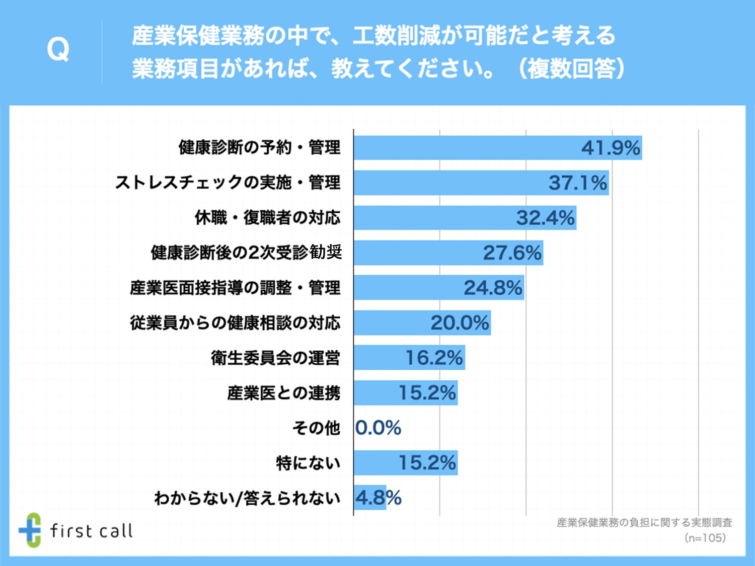 加えて、「産業保健業務の中で、工数削減が可能だと考える業務項目」を調査したところ、「健康診断の予約・管理」が41.9%、「ストレスチェックの実施・管理」が37.1%、「休職・復職者の対応」が32.4%となりました。