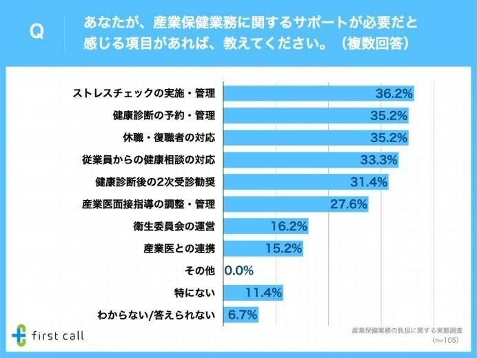 さらに、「産業保健業務に関するサポートが必要だと感じる項目」に関しては、「ストレスチェックの実施・管理」が36.2%、「健康診断の予約・管理」、「休職・復職者の対応」が35.2%となりました。