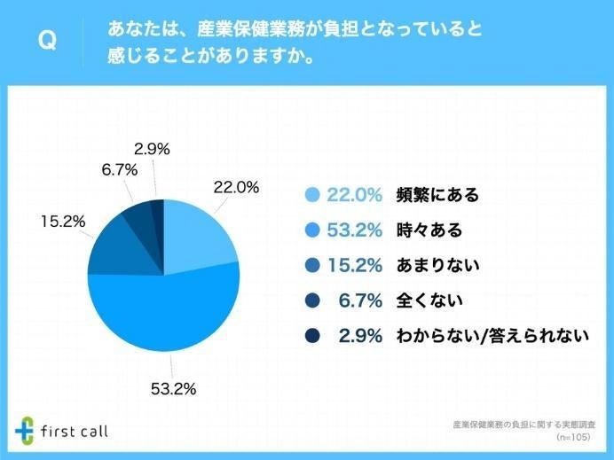 まず初めに、「産業保健業務による負担の実感」を調査したところ、「頻繁にある」が22.0%、「時々ある」が53.3%と合計で75.3%が産業保健業務を負担に感じているという結果となりました。