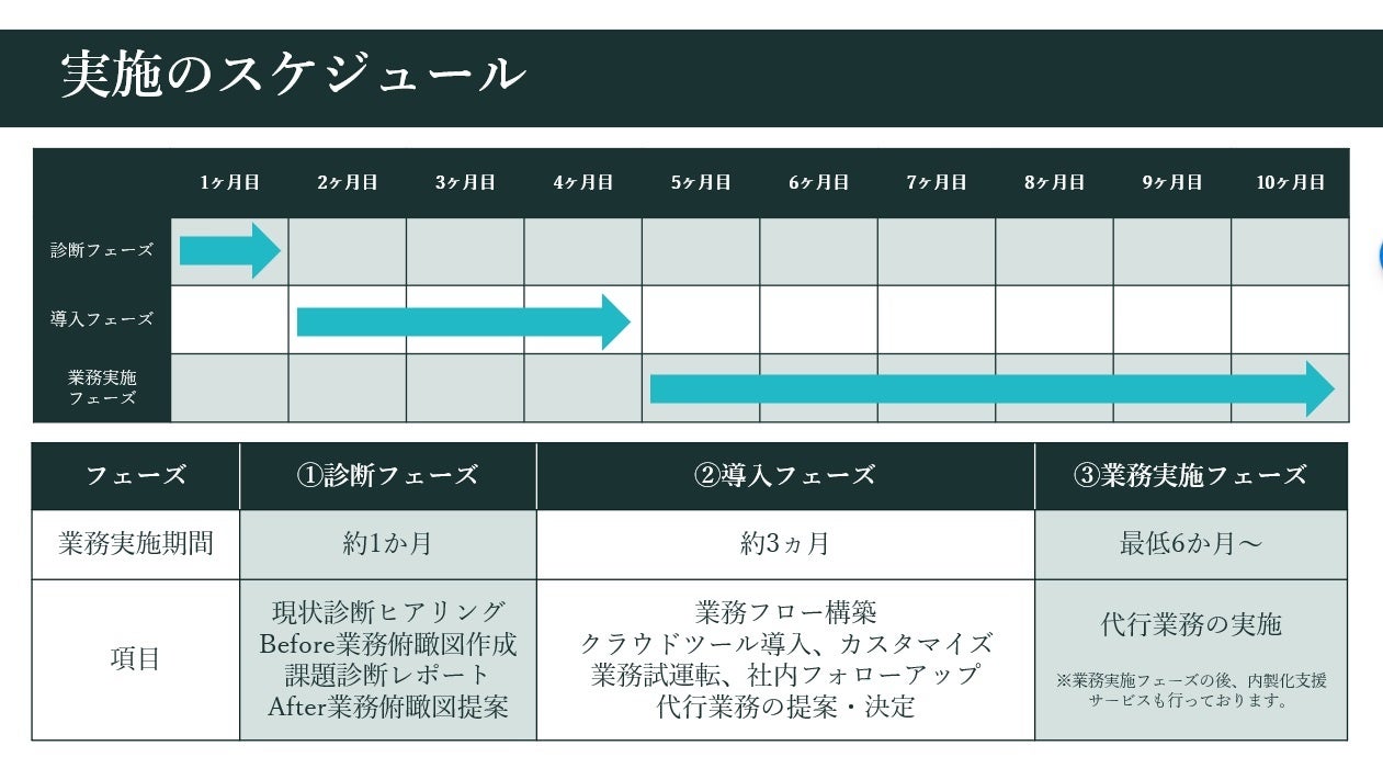 ・本サービスでは年商一億~数十億程度の事業者様を主な対象として、①診断フェーズにて経理業務の現状診断を行い、課題診断レポート、アフタープランのご提案を行います。また、その後の②導入フェーズでは実際の業務フロー構築、各種クラウドツール導入・初期設定等の実作業を始め、社内フォローアップを丁寧に行ったうえで、③業務実施フェーズにて本格的な業務代行に移行していきます。