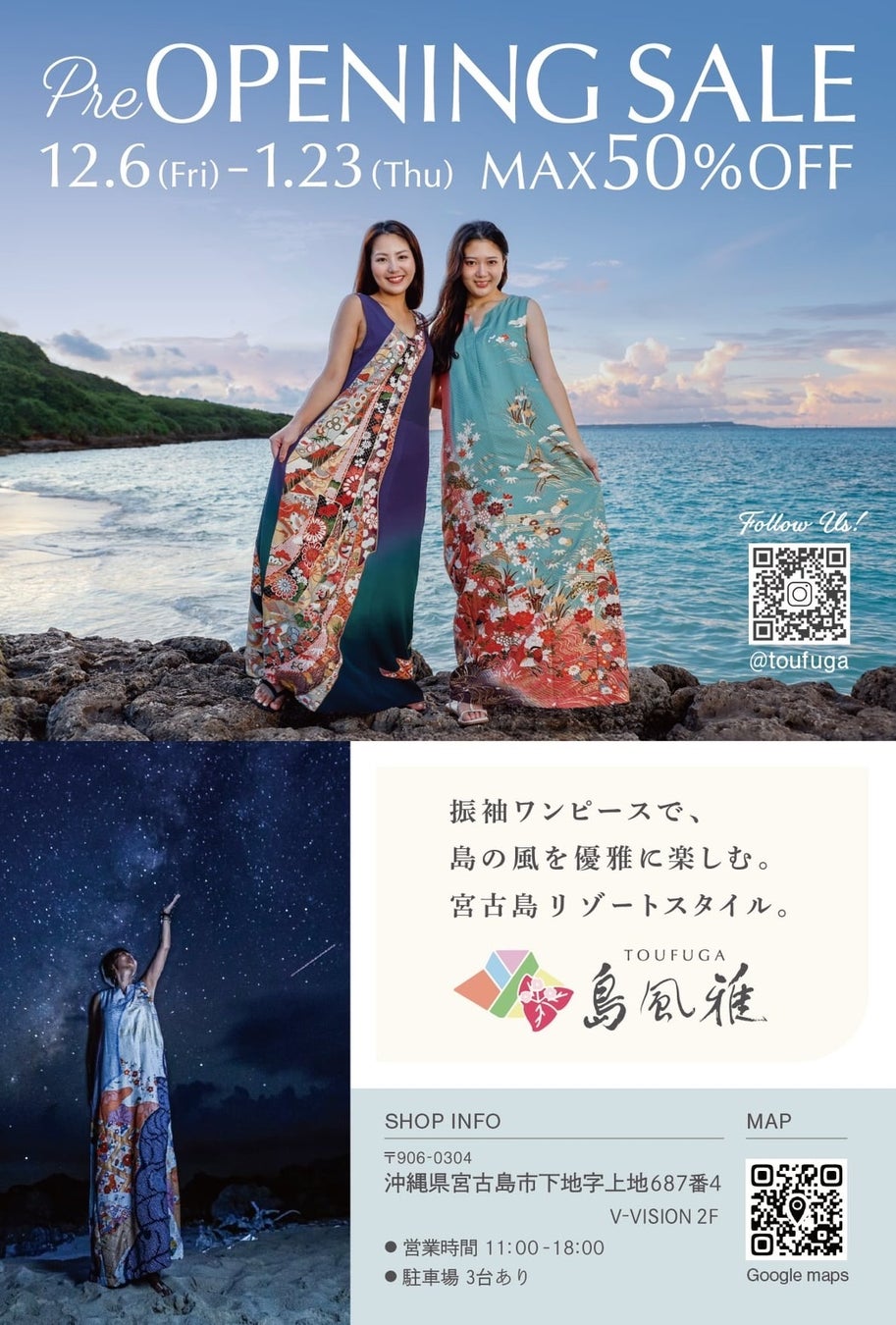 株式会社島風雅(代表取締役:田熊遵子)は、沖縄県宮古島市下地上地にて、振袖リメイクワンピース専門店「島風雅-toufuga-」を2024年12月6日にプレオープンいたします。本オープンは2025年2月4日を予定しており、地元経済への貢献と雇用創出を目指した取り組みです。