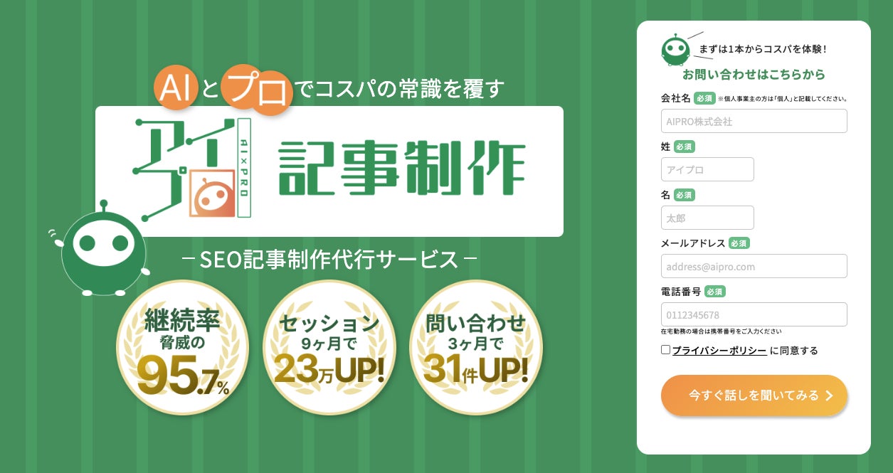 アイプロ記事制作は、AIでコストカットし、プロが品質担保するコストパフォーマンスを重視したSEO記事制作代行サービスです。 構成、原稿、編集、入稿まで巻き取ります。