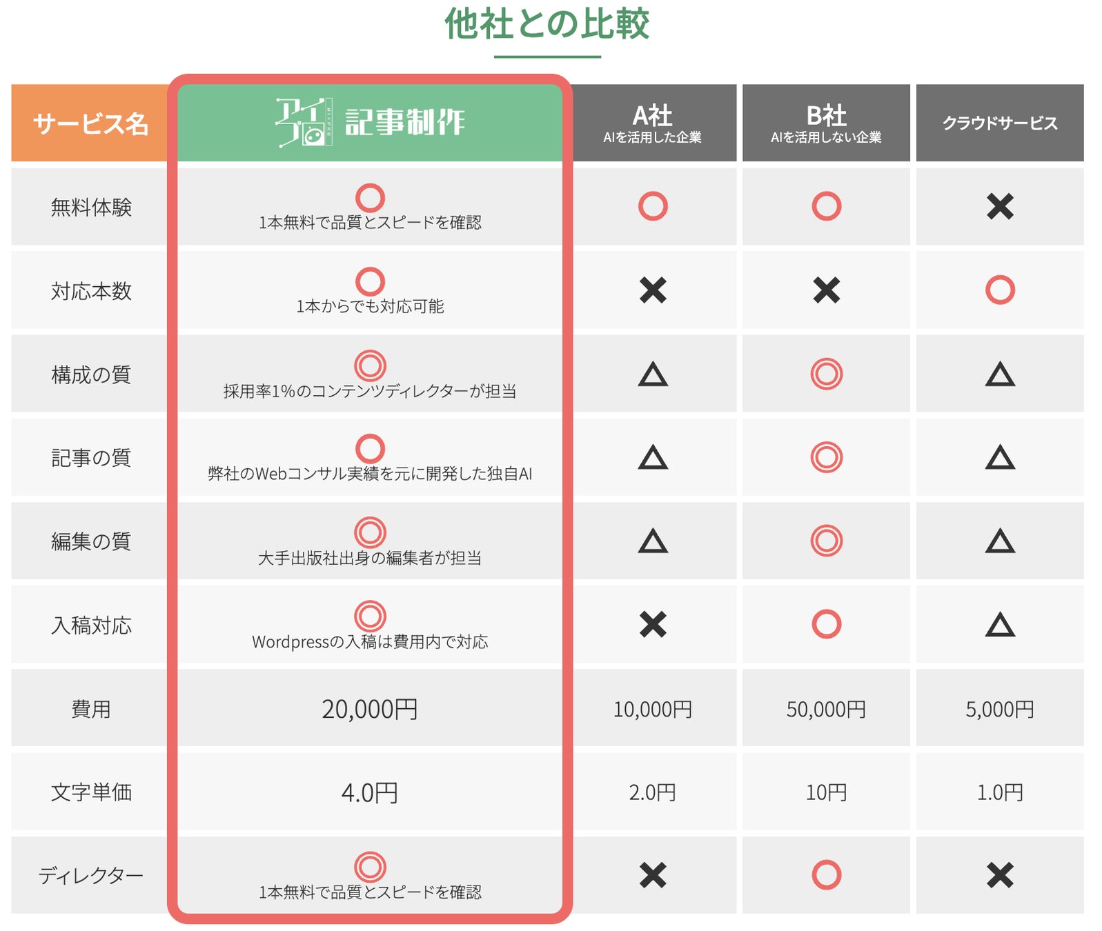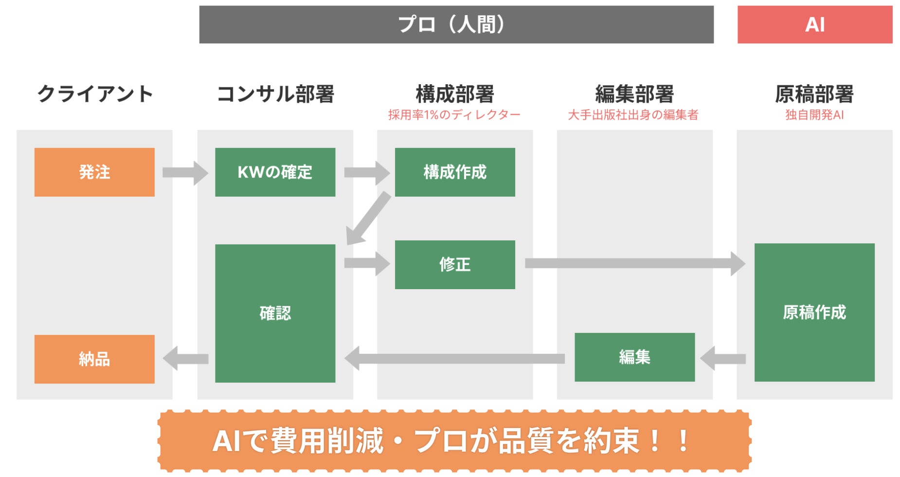 「AIとプロでコスパの常識を覆す」つまり、AIで費用を抑え、プロが品質を高めるがアイプロのコンセプトです。 Webライターでは実現できない品質担保の仕組み・高さ、独自開発記事システム、費用の安さが選ばれる秘訣です。