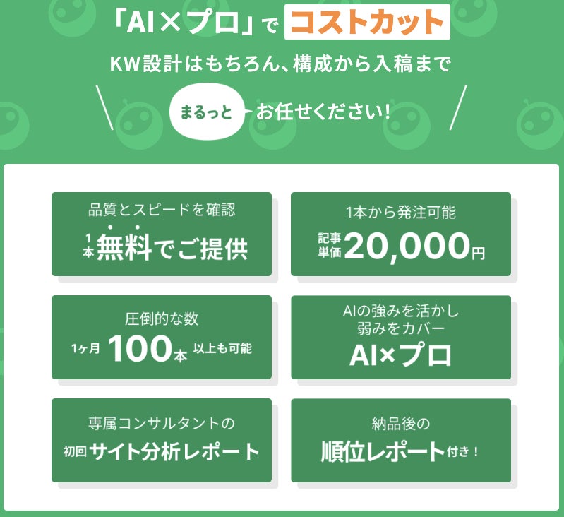 ※現在、サービスの品質とスピードを実感いただくため、1記事分の無料トライアルを実施しております。本キャンペーンでは、実際のサービスと同様の品質とプロセスを体験いただけます。