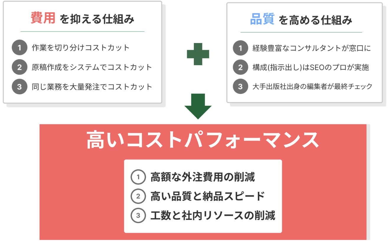 重要なのは構成と編集、最もコストのかかる原稿部分の費用を抑え、さらに作業を切り分け同じ業務を大量発注することでも費用を抑え、高いコストパフォーマンスを実現。