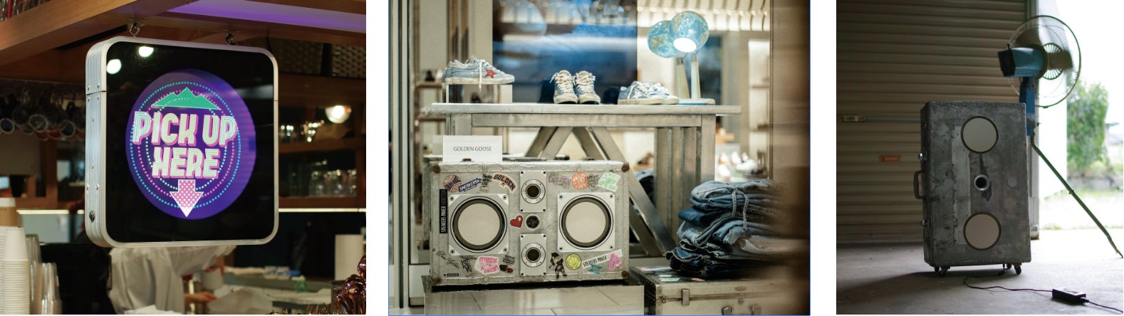 また、古物由来の味わいのあるダメージを活かしたオリジナルのスピーカーや照明看板などを制作する