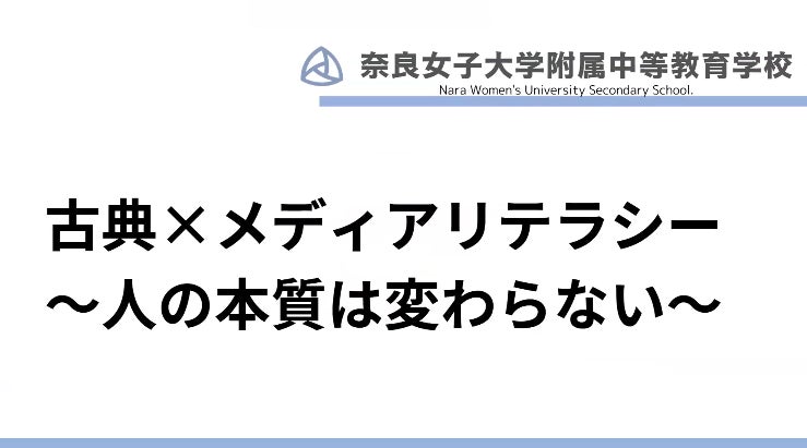 古文の授業でのメディア情報リテラシー向上の学びを開発した奈良女子大学附属中等教育学校の高校生は2023年度に引き続いて授業を開発しました。古来、デマに振り舞わされてきた人間の姿を古文から学ぶとともに、情報に振り回されないネガティブ・ケイパビリティーの重要性に気づいてもらう授業づくりにチャレンジしたと話しました。授業に事前事後でアンケート調査を行った結果、「情報が確からしいか確かめる」生徒の割合が13%増加したとのことでした。