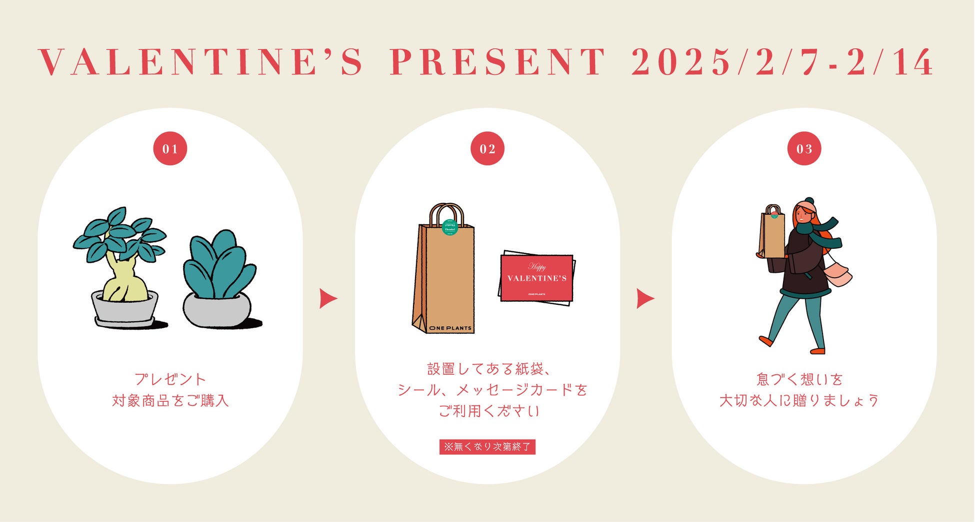 • 名称:「植物で贈る想い」バレンタインキャンペーン • 期間:2025年2月5日(水)~2月14日(金) • 対象:ワンプランツ店舗およびオンラインショップで対象商品をご購入の方
