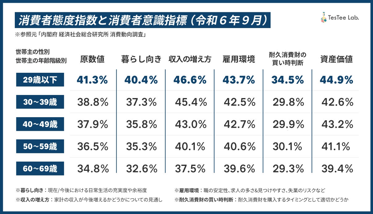 消費者態度指数が高いほど、消費者の経済状況に対する見方がポジティブであることを示しているため、若年層になるほど他の世代と比べ消費が活発に行われる傾向があると言えます。
