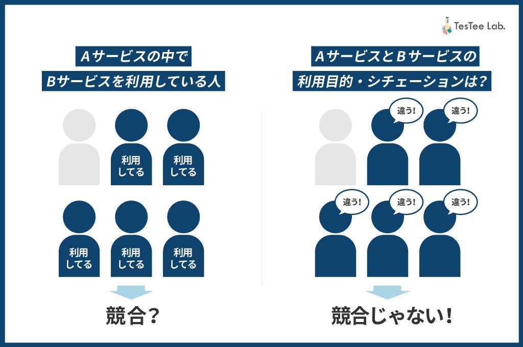 企業の視点だけでこの事実を捉えると、『サービスAとサービスBは競合関係にあるのでは?』と考えがちです。しかし、利用者からサービスAとBそれぞれの利用目的やシチュエーションを聴取すると、それぞれ異なる目的やシチュエーションで利用していることが判明しました。