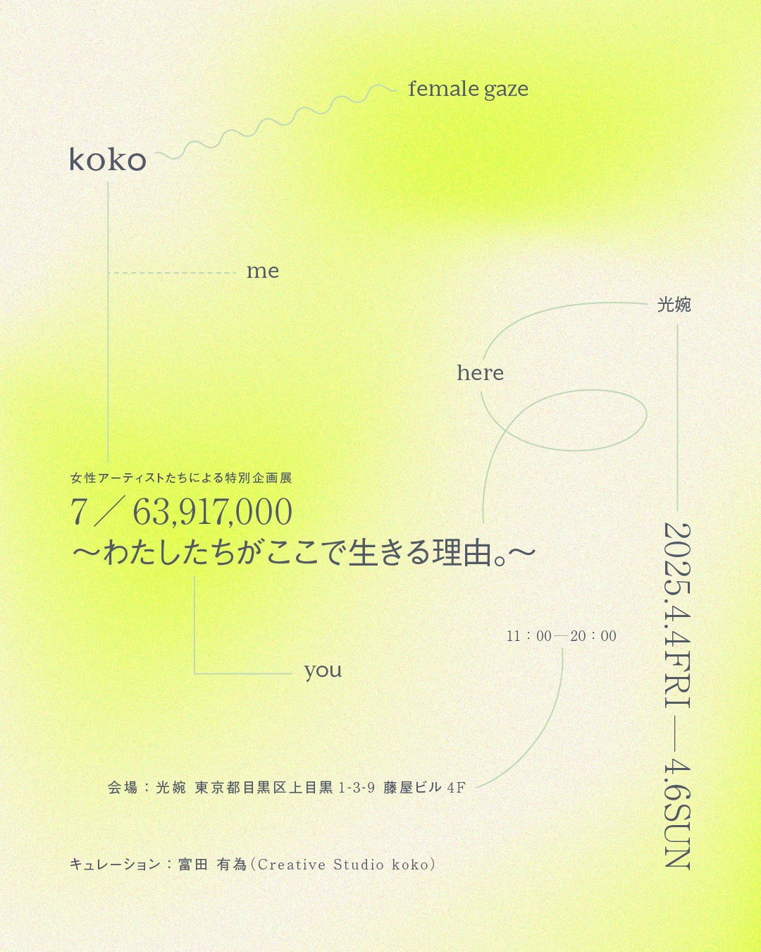 国際女性デー(3月8日)を讃え、株式会社kokodearが運営するCreative Studio koko(本社:東京都渋谷区)は、ART SPACE 光婉 (東京都目黒区)にて、2025年4月4日(金)〜6日(日)の期間、女性クリエイターにフォーカスしたグループ展『7/63,917,000〜わたしたちがここで生きる理由。〜』を開催します。