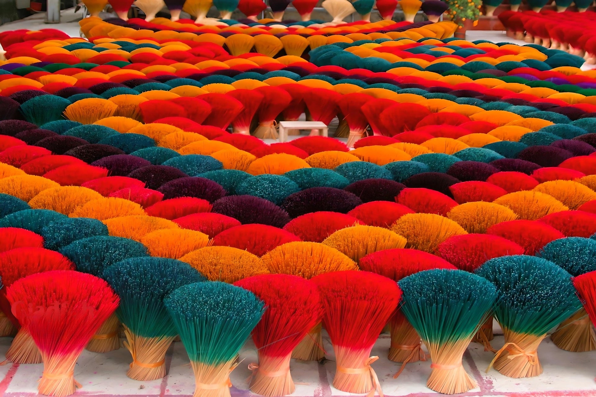 フエで長年続いている伝統的な線香づくりトゥイスアン線香村を訪れます。カラフルな線香を背景にした記念撮影スポットとしても人気です。