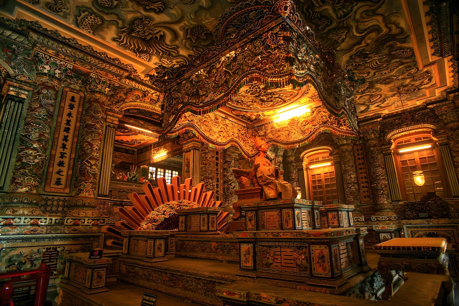 グエン王朝第12代皇帝カイディン帝(在位1916~25)の陵墓で、次代バオダイ帝でグエン王朝は終焉をむかえるため、カイディン帝廟は王朝最後の帝廟となっています。フランスと中国の影響を受けた西洋と東洋の折衷様式で建てられ、アジア各地から集めた美しい器や瓶などを材料として使っており、モザイク装飾には中国の陶器や日本のビール瓶も使われています。