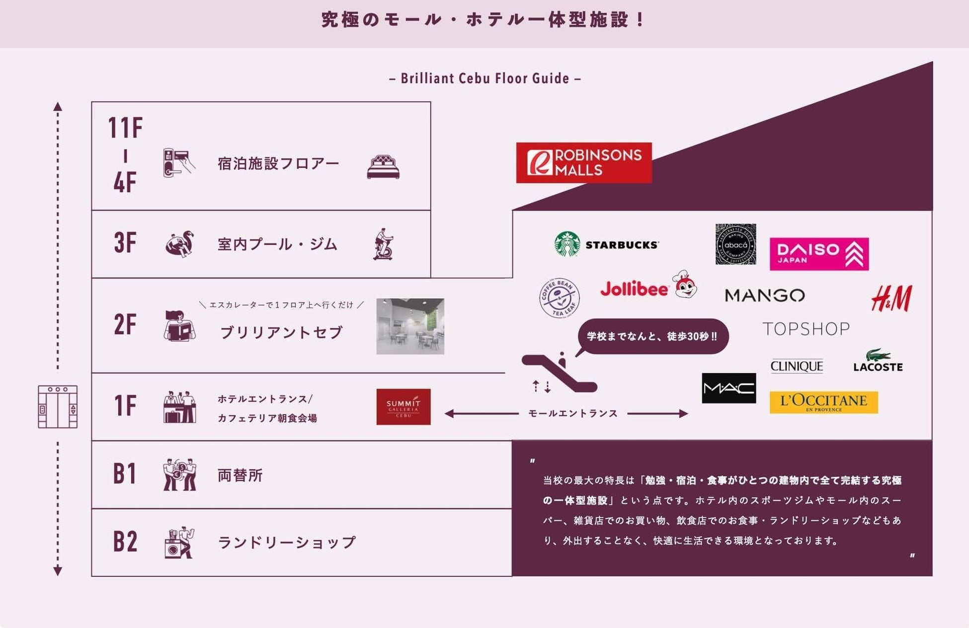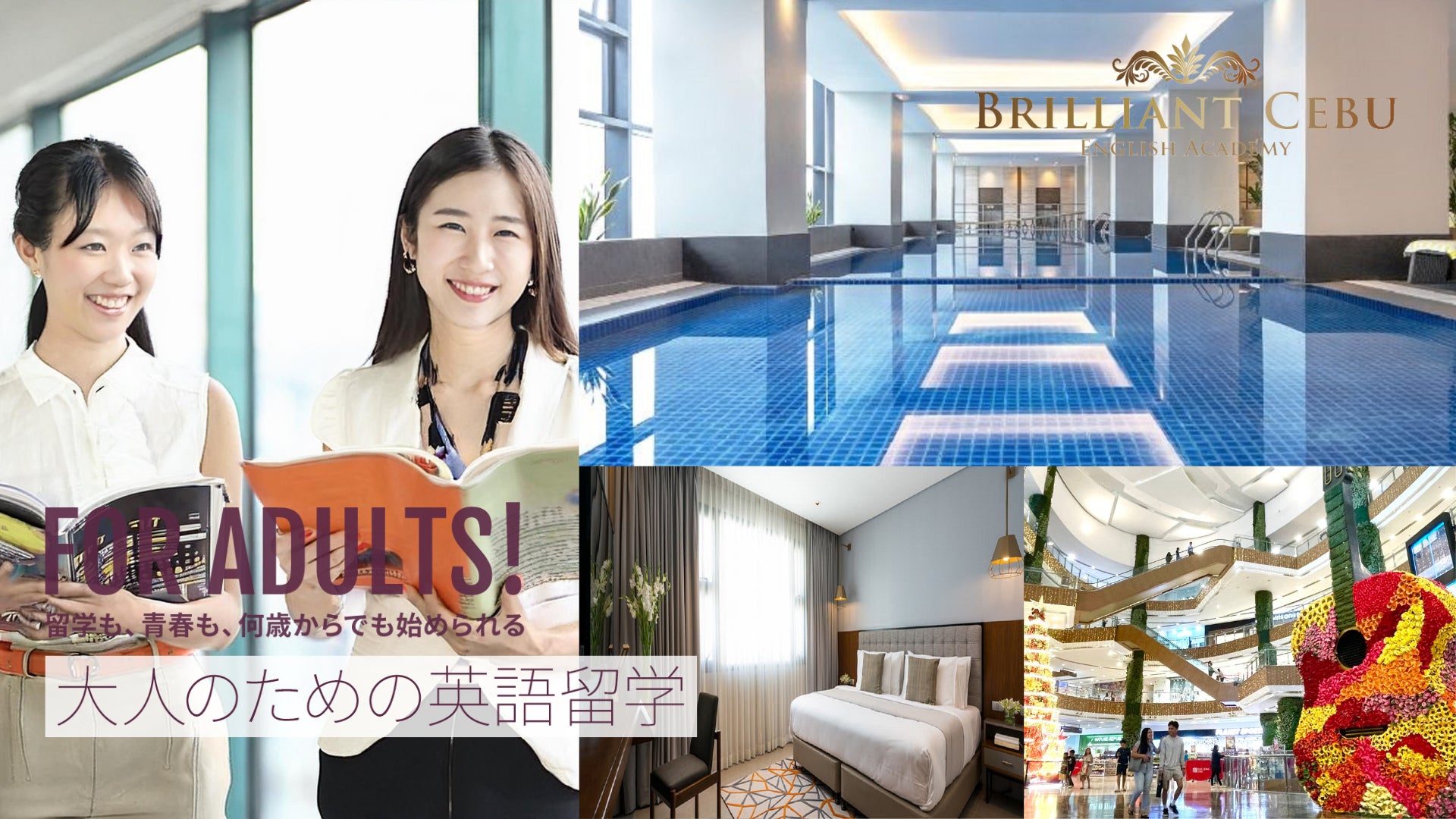 ョナル)は、フィリピン・セブ市に「社会人留学生に特化した学校として、Brilliant Cebu English Academy」を、ハイエンドなホテルと一体型の大型ショッピングモール(ロビンソンガレリアモール内)に2025年3⽉1日に新規リニューアル開校いたします。ブリリアントセブ校は、リニューアル開校に伴い第1期生の留学生を募集中です。まずは、お問合せ及びカウンセリング受け付けを承ります。