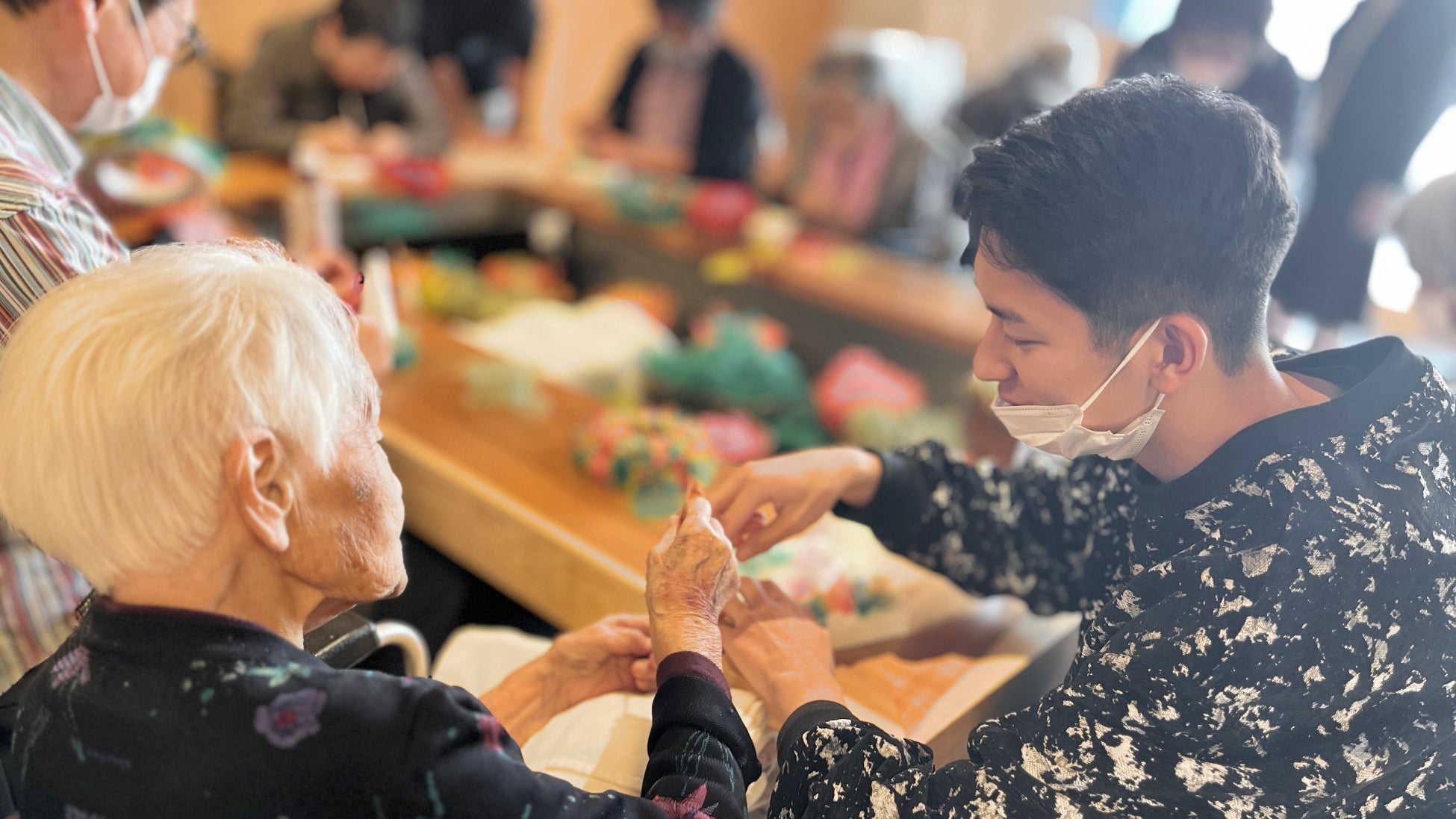 施設の一大イベント納涼祭を開催するのみに留まらず、地域の方が継続的に訪問下さるためのアクションにも関わって頂きました。栗林荘内で有志スタッフが定期的に開いている「手芸部」の活動です。