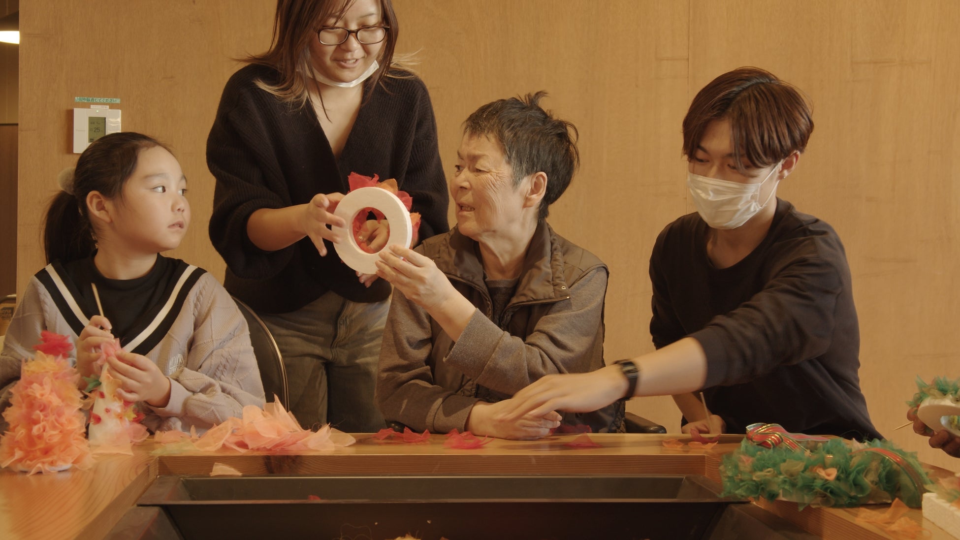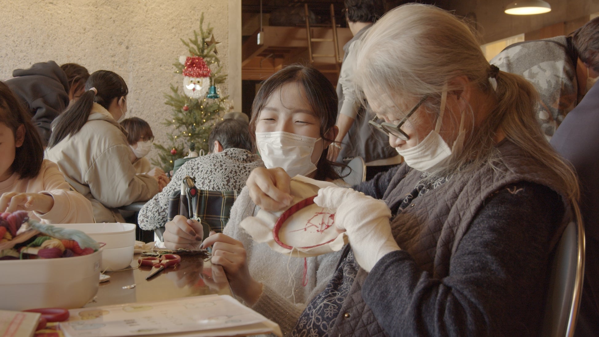 地域の子どもから大人まで15名が集まり、布のはぎれを使ったリースやオーナメントなどを利用者様も交えて作っていきました。最後はオーナメントを荘内各地のクリスマスツリーに飾り付け、参加して下さった皆様の色に栗林荘が彩られました。