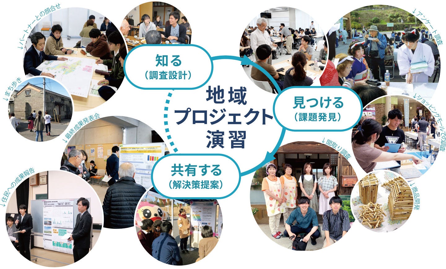 宇都宮大学地域デザイン科学部 http://rd.utsunomiya-u.ac.jp/ では、①コミュニケーション力 ②プレゼンテーション力 ③調査・分析力 ④チームの一員として動く力(協働力)の4つを含む「地域対応力」の養成を目的として、コミュニティデザイン学科・建築都市デザイン学科・社会基盤デザイン学科の3学科合同演習授業「地域プロジェクト演習」を開講されています。