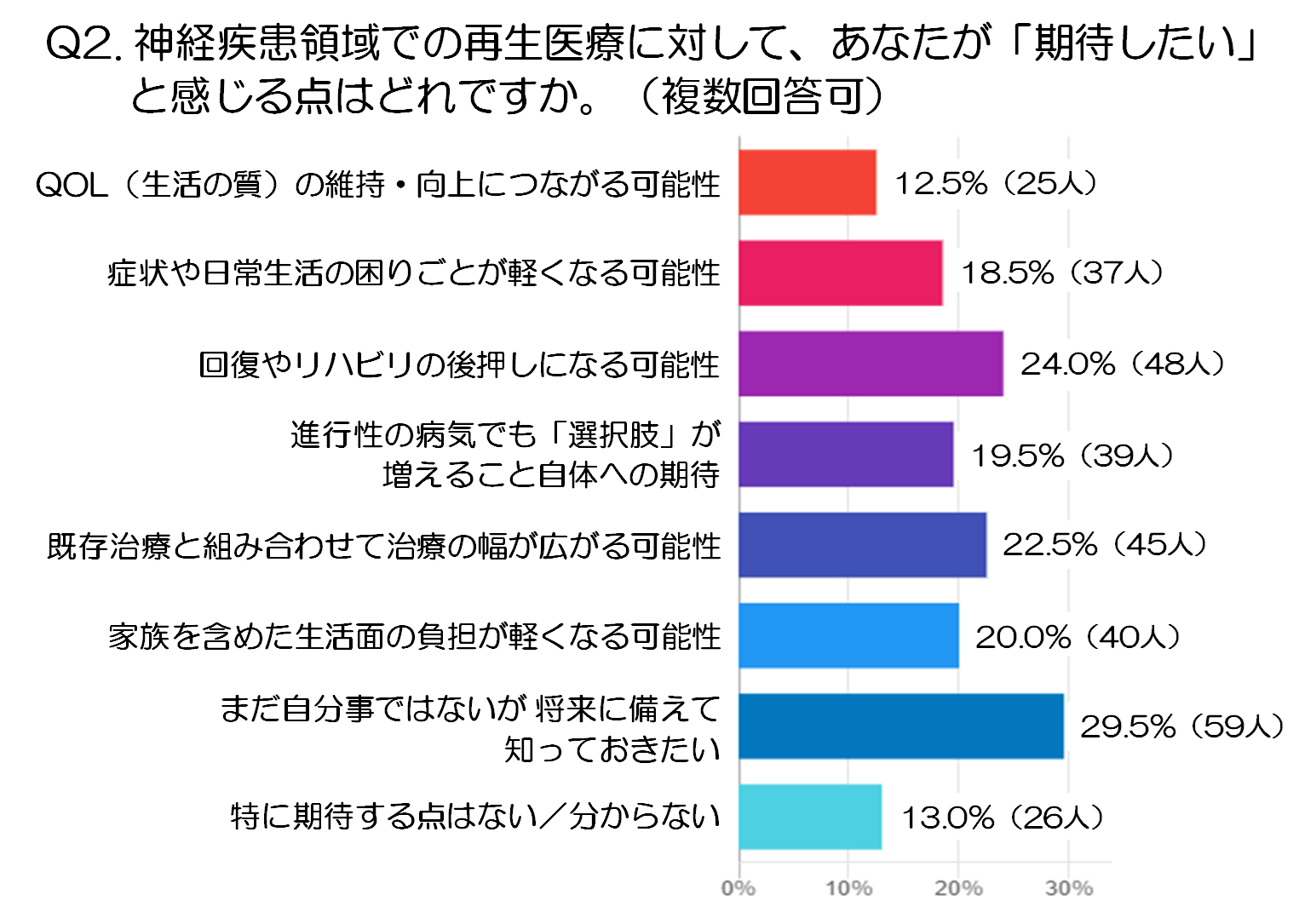 一方で、「QOL(生活の質)の維持・向上につながる可能性」は12.5%(25人)でした。生活の質の維持や向上は重要なテーマですが、今回の結果では、「回復」や「治療の幅が広がる」といった、より変化をイメージしやすい項目に関心が集まる傾向が見られました。