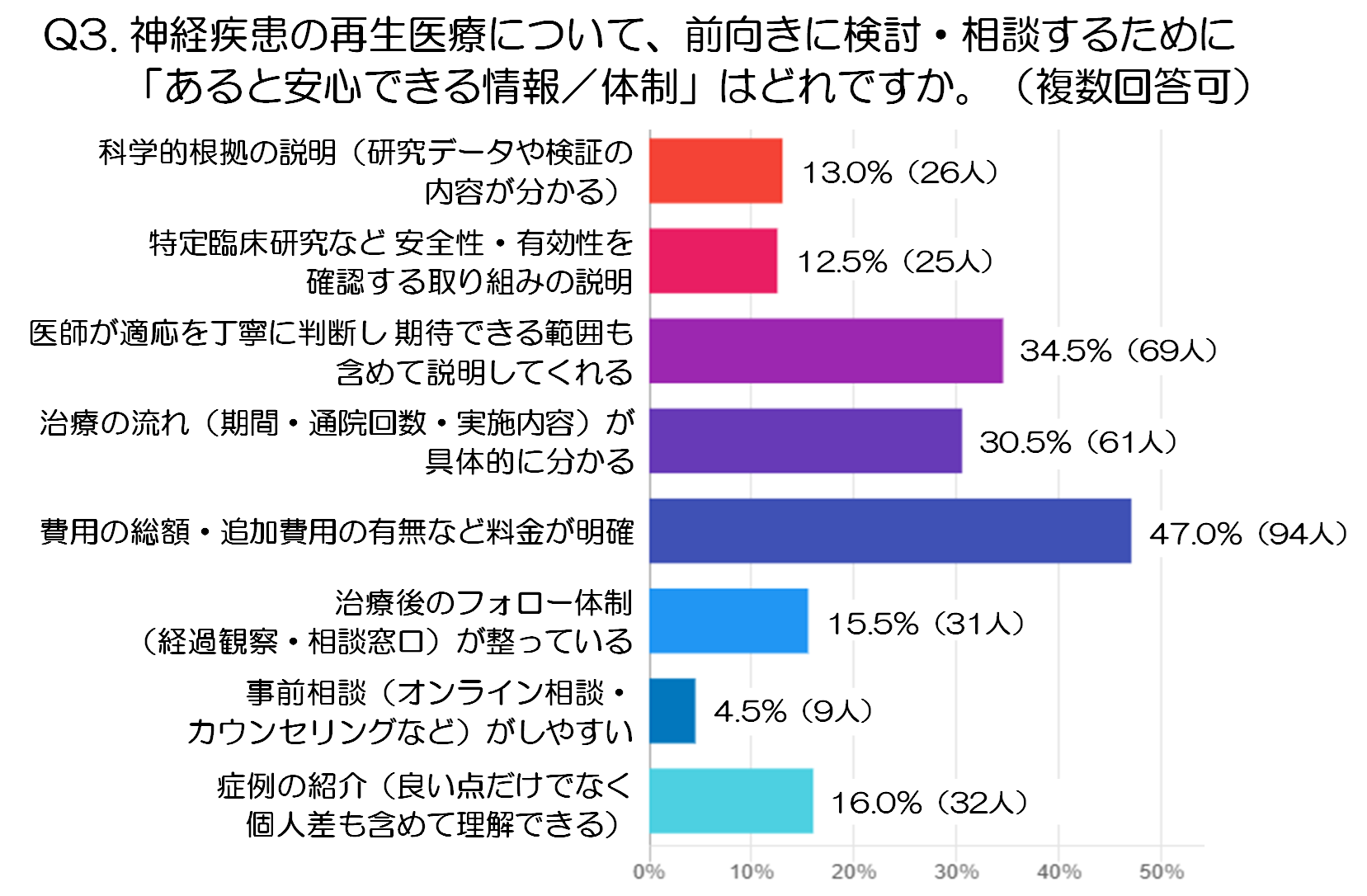 Q3.神経疾患の再生医療について、前向きに検討・相談するために「あると安心できる情報/体制」はどれですか。(複数回答可:注2)