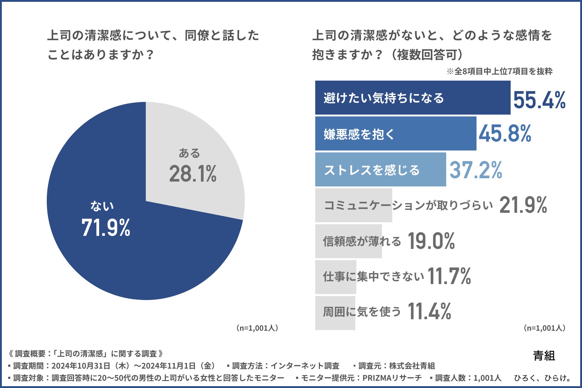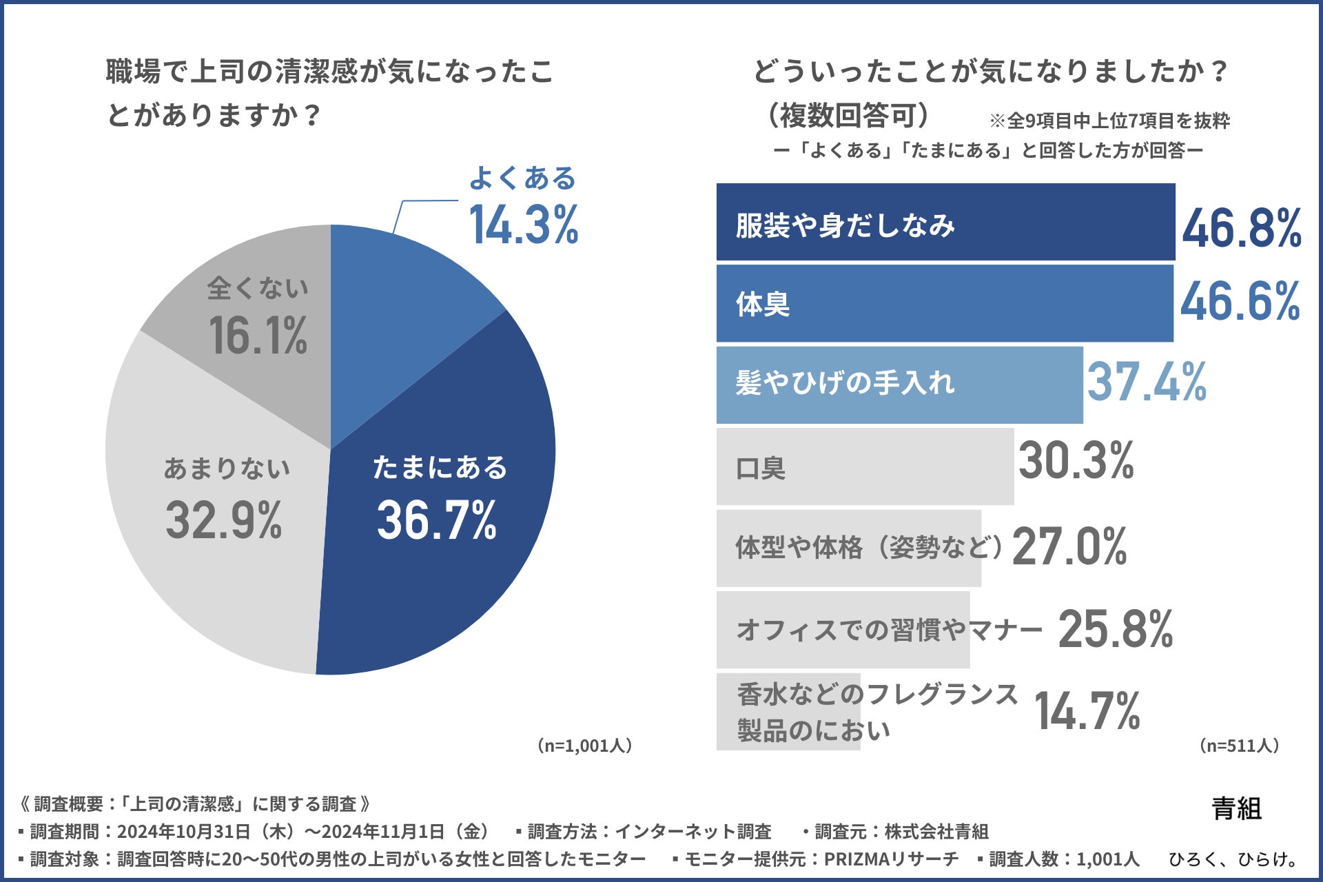 株式会社青組(所在地:東京都杉並区、代表取締役CEO:平敷 護)は、20代~50代の男性の上司がいる女性を対象に、「上司の清潔感」に関する調査を実施しました。