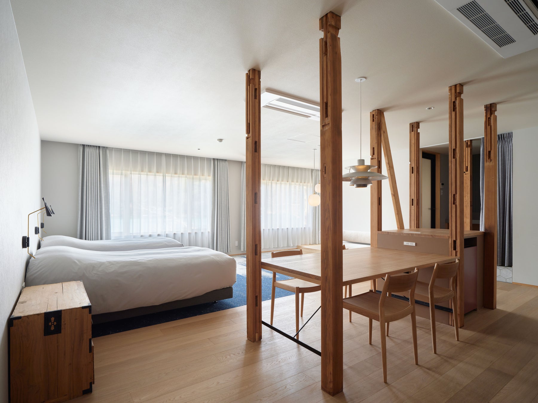 全7室のうち6室が湖に面しており、ひと部屋ずつ形やスタイルが異なります。八ヶ岳の贅沢な眺めを独り占めできるグランドスイートルーム(定員4名)や、窓辺のベンチや浴室から景色の変化を感じられるレイクフロントツイン(定員2名)、仕事や創作活動にぴったりのクリエイターズ・ツイン(定員2名)など。詳細は公式サイトをご覧ください。