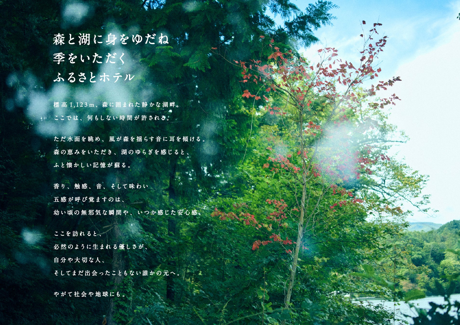 HOTEL MIYAMは、長野県小海町の標高1,123m、静かな森に囲まれた松原湖畔に佇む小さな宿です。MIYAMが大切にしているのは、自然に身をゆだね、季(とき)の移ろいを感じながら、心の赴くままに過ごすこと。地域の人や風土に触れ、自分を取り巻く環境や社会に想いを馳せること。植物の香りや自然の音、そして地のものを生かした食のひと皿。五感をひらき、自分だけの豊かさを、ゆっくりと感じてみてください。