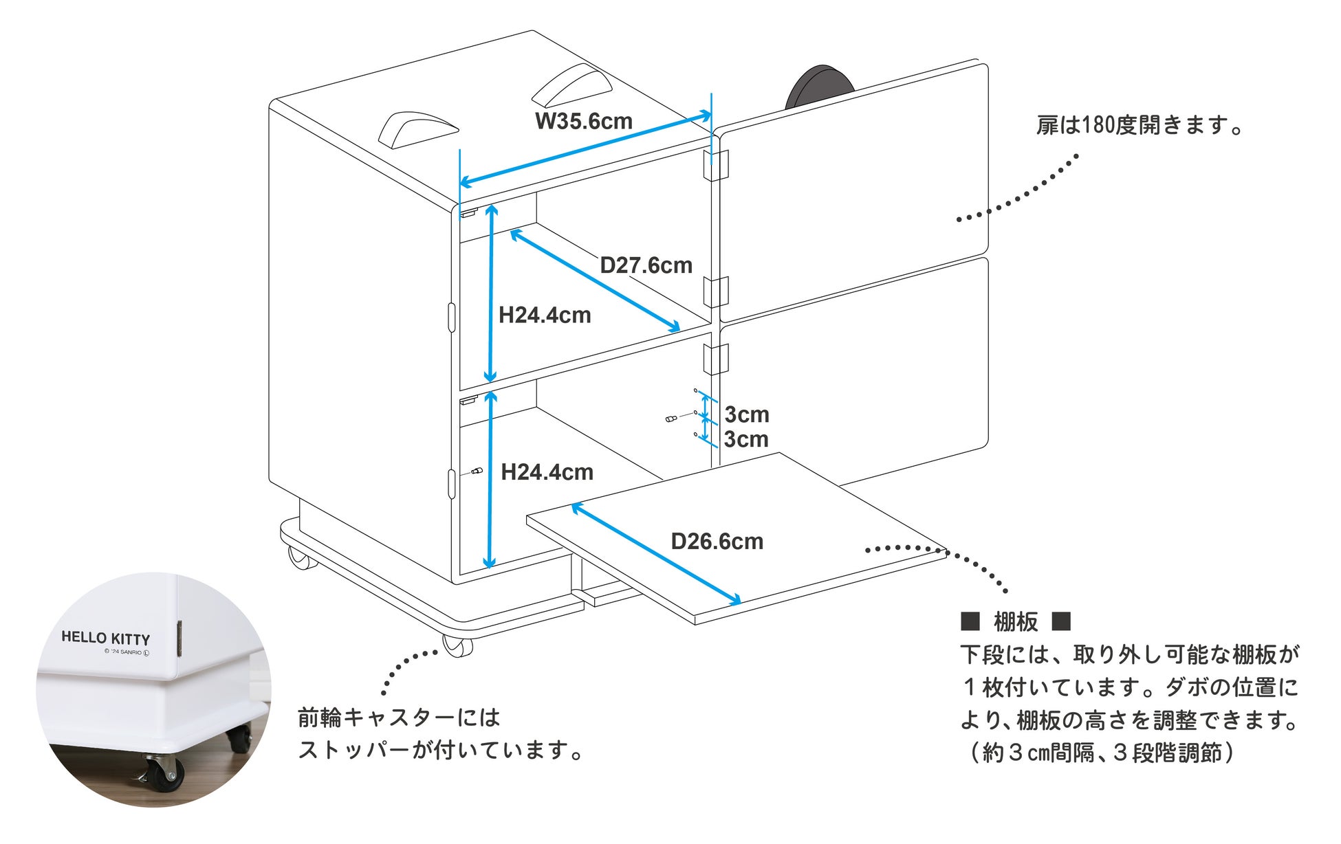 当商品は、株式会社ニチガンが手掛けるロボット型キャスターチェストの第一弾として、昨年50周年を迎えたハローキティをモチーフに開発されました。ハローキティのデザインと共に、チェストとしても高さ630cmと十分な収納力があり、胸の部分を開けると取りはずし可能な棚板が1枚付いています。ダボの位置により高さの調節も可能。