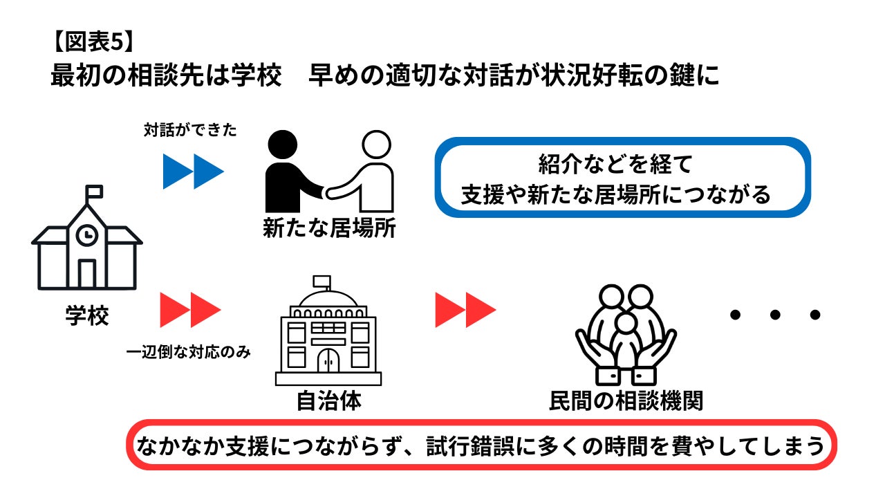 学校での相談がうまくいかない場合、地域(自治体)、民間の相談機関へと助けを求めた親もいます。相談相手が見つけられないことでなかなか支援につながらず、試行錯誤に多くの時間を費やしてしまうケースもあります【図表5】。