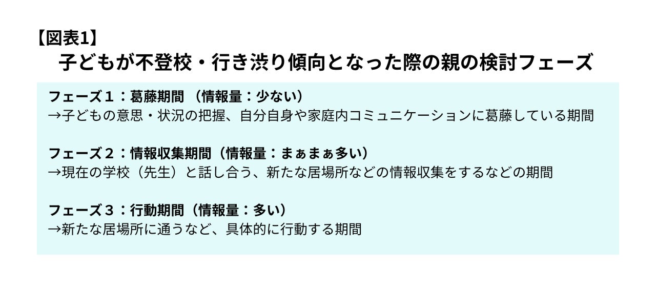 最初の「フェーズ1」は、親として不登校や行き渋りに困惑しながらも、子どもの状況把握や家庭内のコミュニケーションの難しさに葛藤する期間。次に「フェーズ2」として、通っている学校の先生と話し合ったり新たな居場所を検討したりするなど具体的な情報収集を行う期間。最後は新たな居場所に通い始めるなど次の段階に移行する「フェーズ3」です。