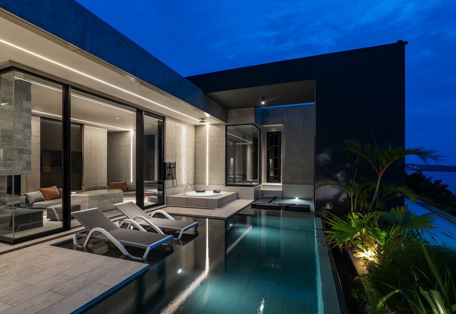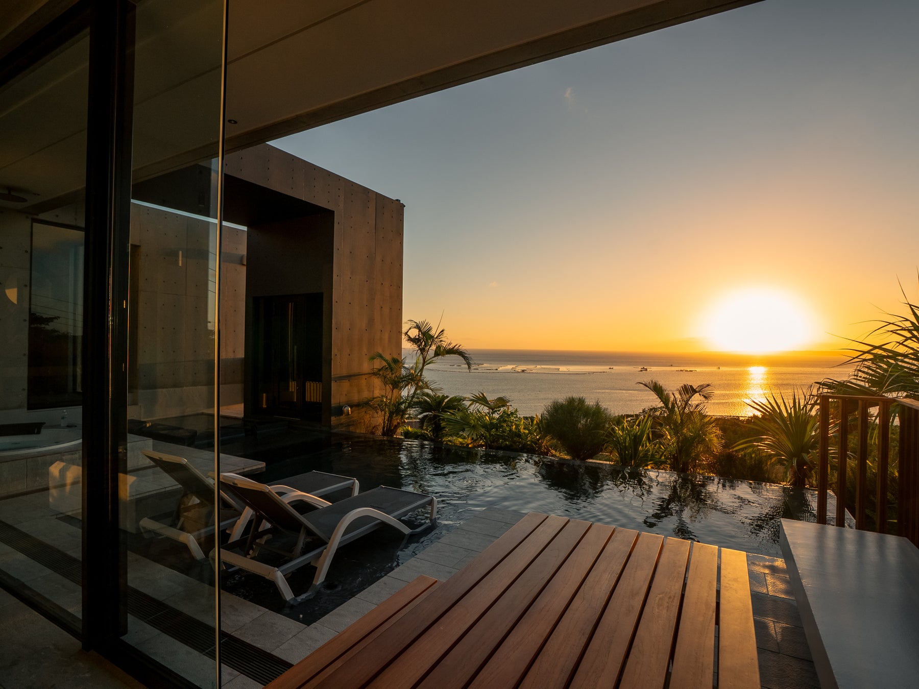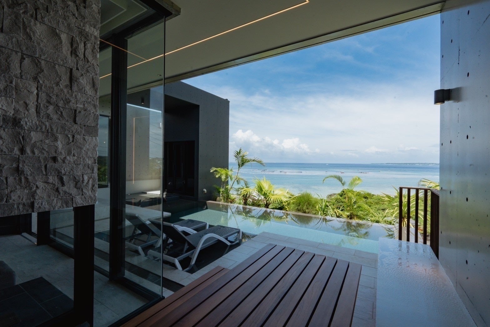 沖縄の高台に位置する本施設は、東シナ海や伊江島を望む圧巻のパノラマビューを誇り、温水インフィニティプール、屋外ジャグジー、プライベートサウナを完備。季節や天候を問わず一年中快適にご利用いただける環境を整えています。