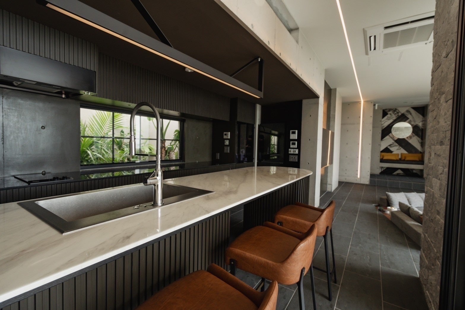 館内にはキッチン設備を備え、ゲストご自身で沖縄の旬の食材を用いて自由にお楽しみいただける、“暮らすように泊まる” スタイルのヴィラです。キッチンには、ガゲナウのIHコンロをはじめ、BALMUDAのトースター、オーブン、ホットプレートを完備し、本格的な料理もお楽しみいただけます。また、ワインセラーも備わっており、お好みのワインを持ち込んで過ごす贅沢なひとときも魅力です。